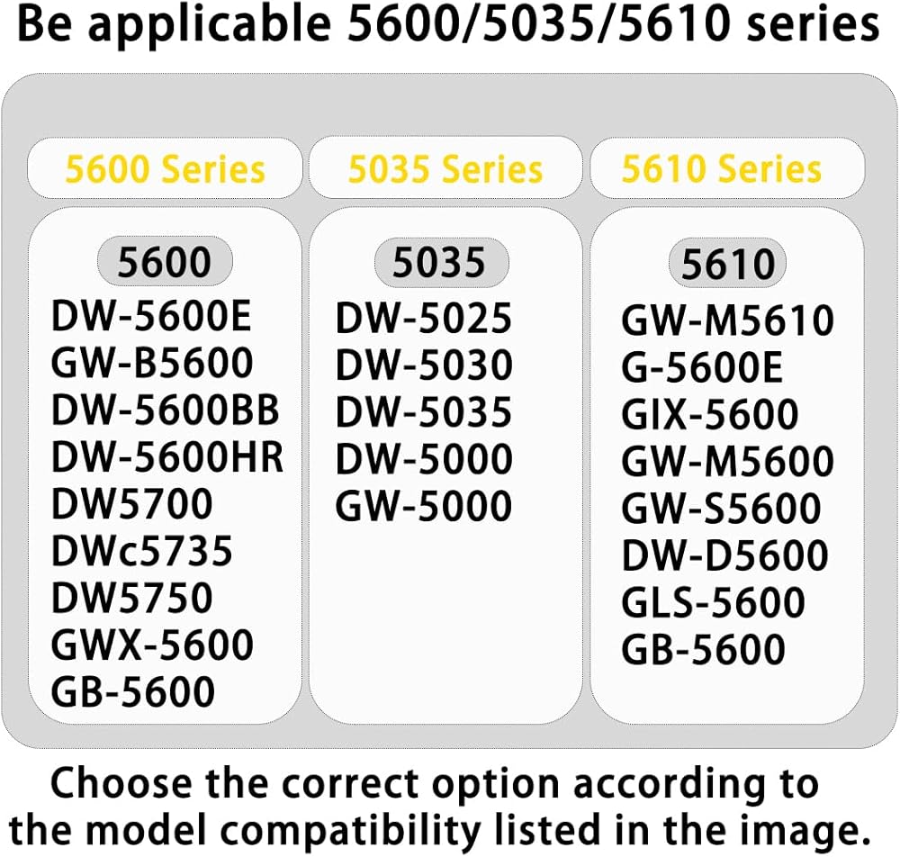 5610 Series: GW-M5610, G-5600E, GLS-5600, GW-M5600/S5600, DW-D5600, GB-5600, etc.