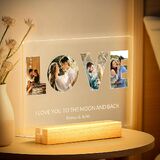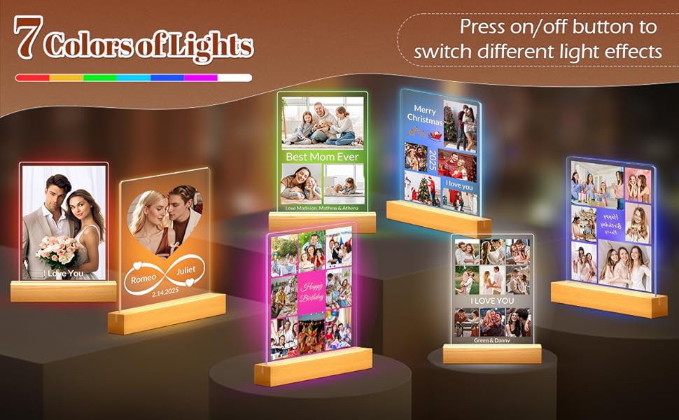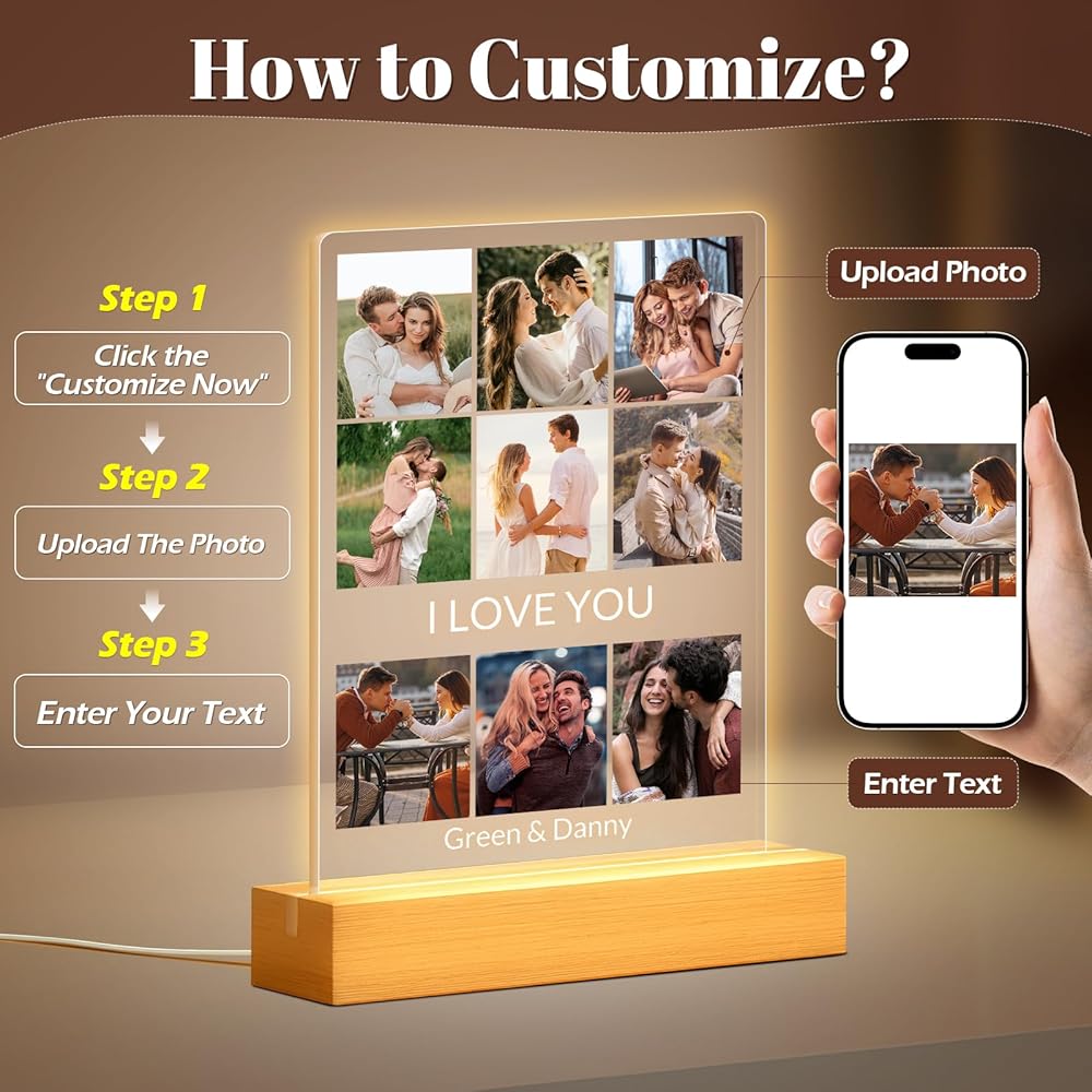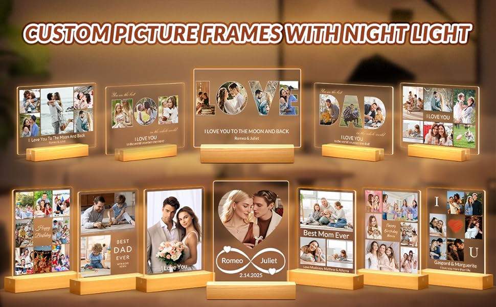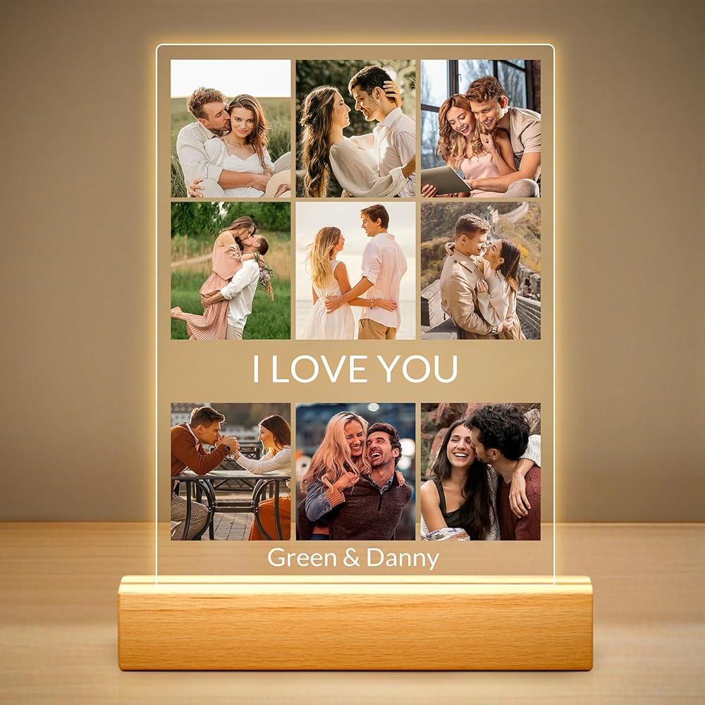 إطار صور مخصص مع إضاءة ليلية: ما عليك سوى تحميل صورك المفضلة وإضافة نص مخصص لإنشاء لوحة صور أكريليك فريدة من نوعها مع ضوء ليلي مدمج. يعرض هذا العرض الفني ذكرياتك الثمينة بشكل جميل، مما يضيف لمسة من الرومانسية والمعنى إلى أي مساحة.