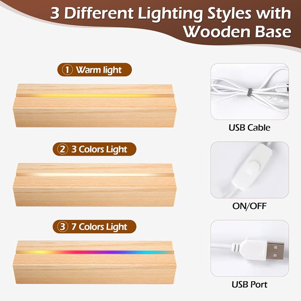 خيارات إضاءة ليلية متعددة: القاعدة الخشبية لإطار الصور الأكريليكي المخصص متوفرة بثلاثة أنماط إضاءة: الضوء الدافئ، والضوء 3 ألوان، والضوء 7 ألوان. تتيح لك هذه الخيارات خلق أجواء مثالية لأي مناسبة، مما يضيف الدفء الرومانسي إلى ديكور منزلك.