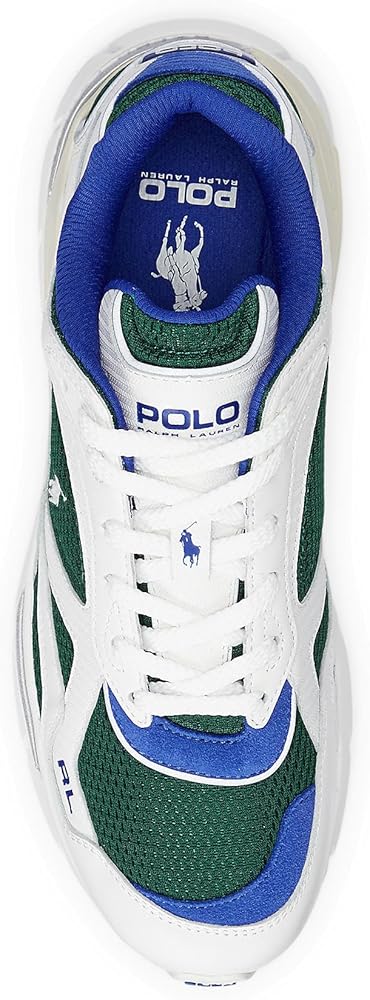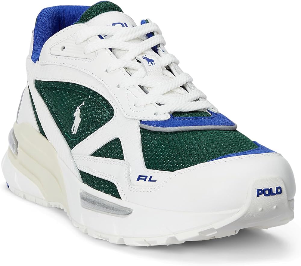 The Trackster 275 updates Polo's performance sneaker with design details inspired by early 2000s running shoes, including streamlined overlays and metallic piping to lend a dynamic feel. Crafted with leather, mesh, and suede, it features a lightweight EVA compound midsole with integrated logo accents. Rounded toe. Lace-up front. Reinforced heel. Metallic faux-leather piping. Signature Pony at the side. “Polo” and “RL” at the toe. “Polo Ralph Lauren” and signature Pony at the tongue. “Polo” and “Ralph Lauren” at the heel. Mesh lining. Eyestay lined with faux leather. Ergonomic molded foam footbed. EVA midsole. Treaded rubber outsole. Upper: leather, suede, polyester, polyurethane. Lining: polyester, elastane, polyurethane. Imported.