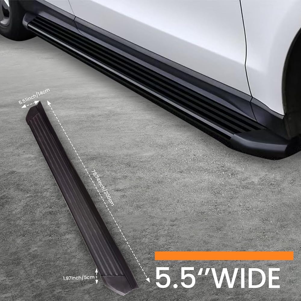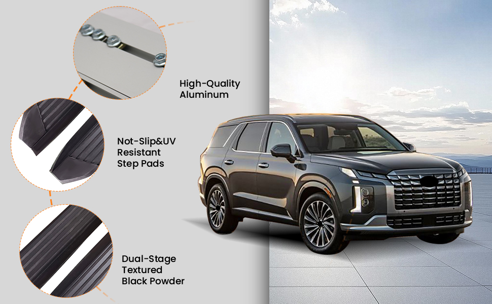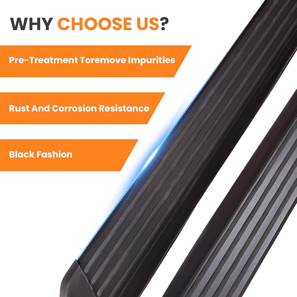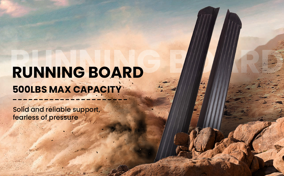 • مواصفات ألواح الجري والدرجات: العرض المناسب في الخطوات. واسعة بما يكفي لتشعر بالمتانة والأمان. توفر هذه الخطوات الأنبوبية على شكل منصة قدمًا آمنًا عند ضمان دخول سيارتك أو الخروج منها على أي تضاريس. كما أنها تتميز بوظيفة مضادة للانزلاق، ومتوافقة للغاية مع طراز سيارتك.
