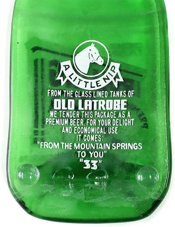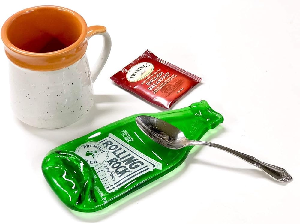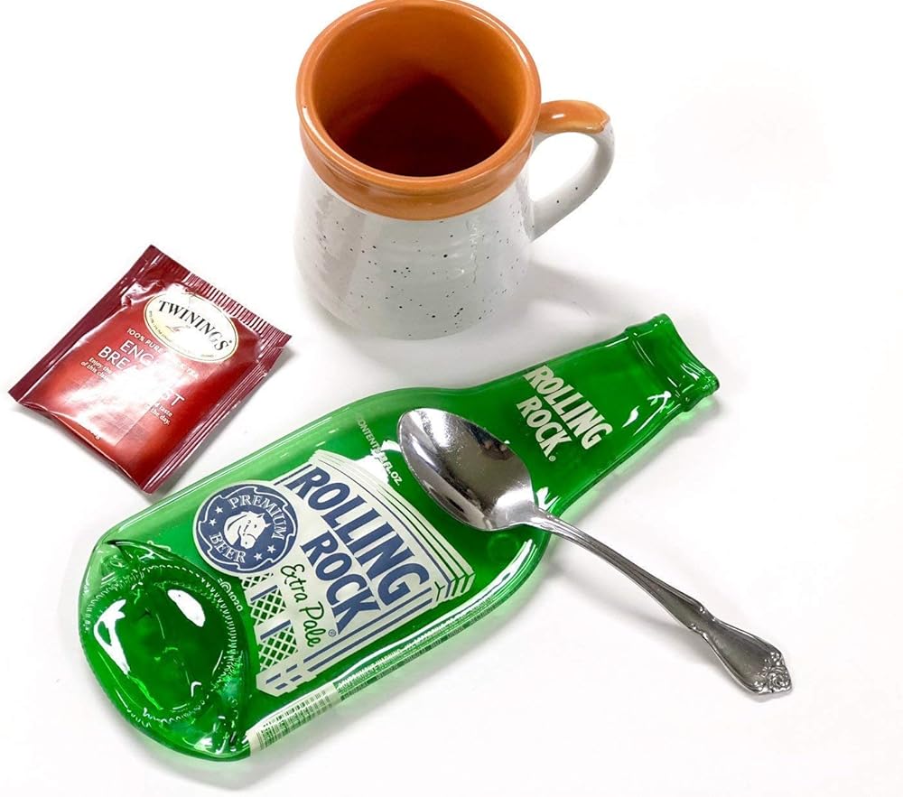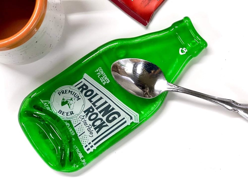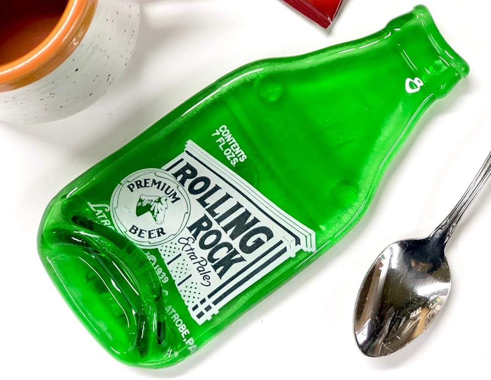 Fantastic, vintage, green glass Rolling Rock "A Little Nip" bottle with blue and white paint from Latrobe, PA. This bottle is melted flat and would make a fabulous spoon rest or wall hanging or beside your grill. The label is the original painted label that is perfectly preserved during the melting process and is permanent and extremely durable. This melted bottle comes with four rubber feet so it sits nicely on your countertop. This is a small, 7 oz. size bottle and measures approximately 7" x 3 1/4" (This is a recycled bottle and may have minor imperfections and/or slight variations that add to its upcycled appeal.) Handmade by Linda and Greg Mitchell in our home studio in Pittsburgh, PA. Thanks for supporting American Craft! It's just the two of us working in our home studio so we do occasionally run out of inventory - buy now! Thanks!