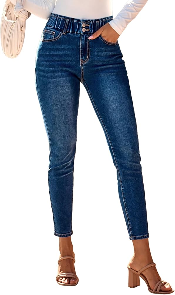 بنطلون جينز نسائي ضيق عالي الخصر من SHEWIN بنطال جينز ضيق عصري قابل للتمدد بأزرار بطول كامل من قماش الدنيم مع جيوب