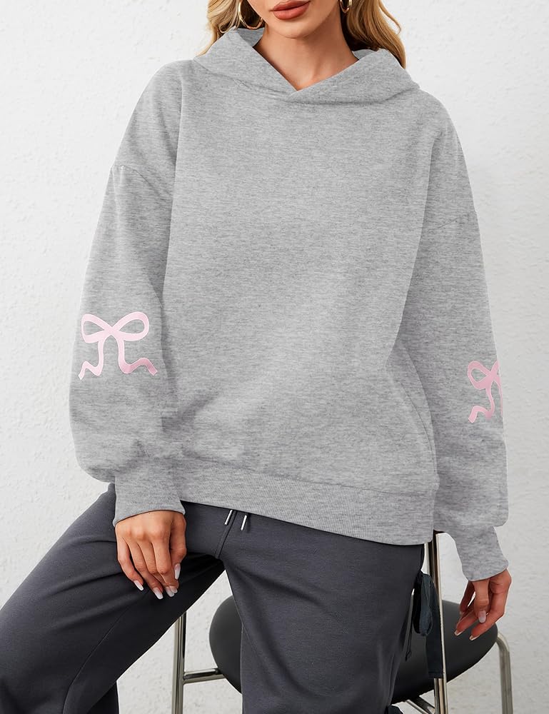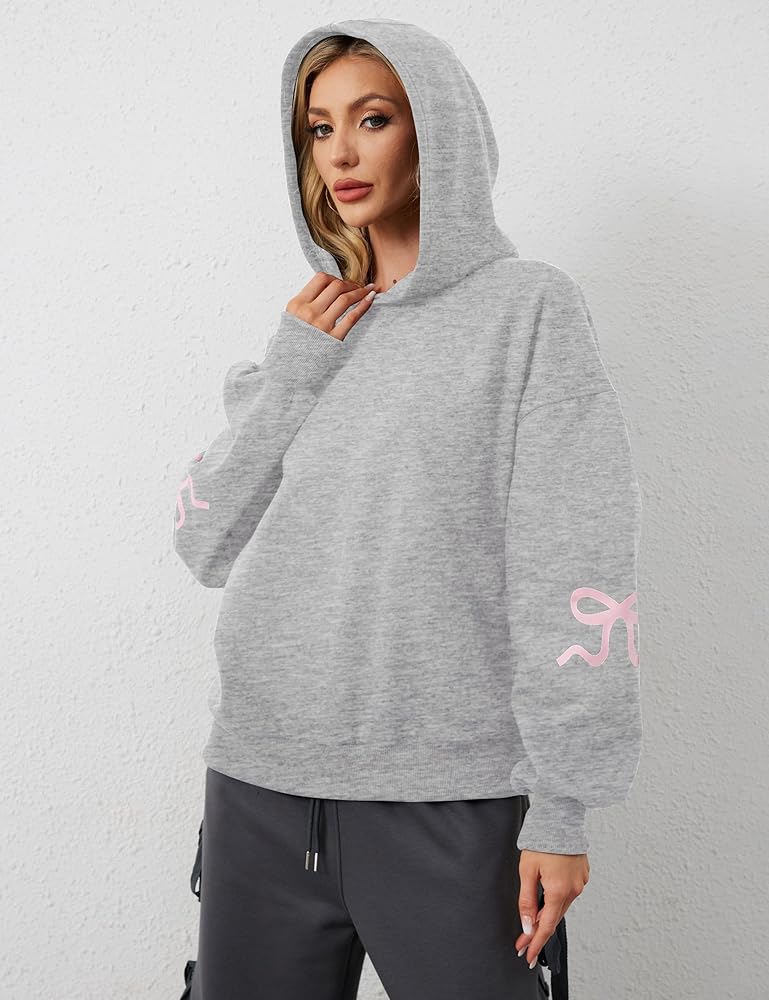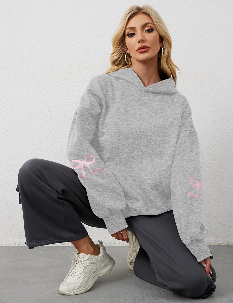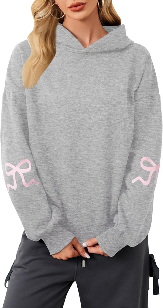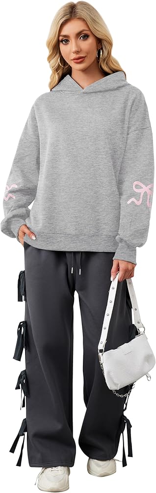 السمات: لون موحد، تصميم كتف منسدل، أساور مضلعة، طباعة جرافيك على شكل فيونكة وردية، مبطن بالصوف، بلوفر بقلنسوة، سويت شيرت فضفاض بقلنسوة ملابس خريفية للنساء، طباعة نمط القوس على الأساور، تضيف لمسة من الجاذبية إلى هذه القلنسوة