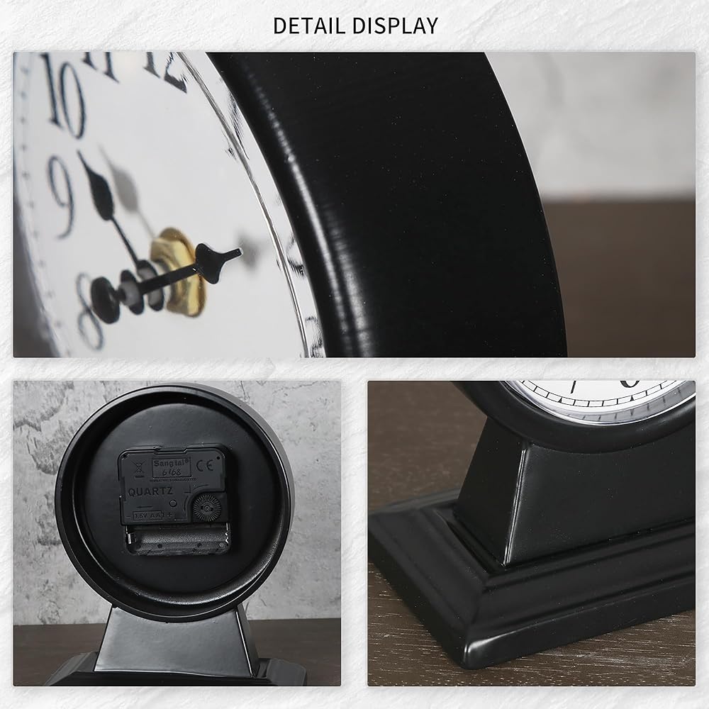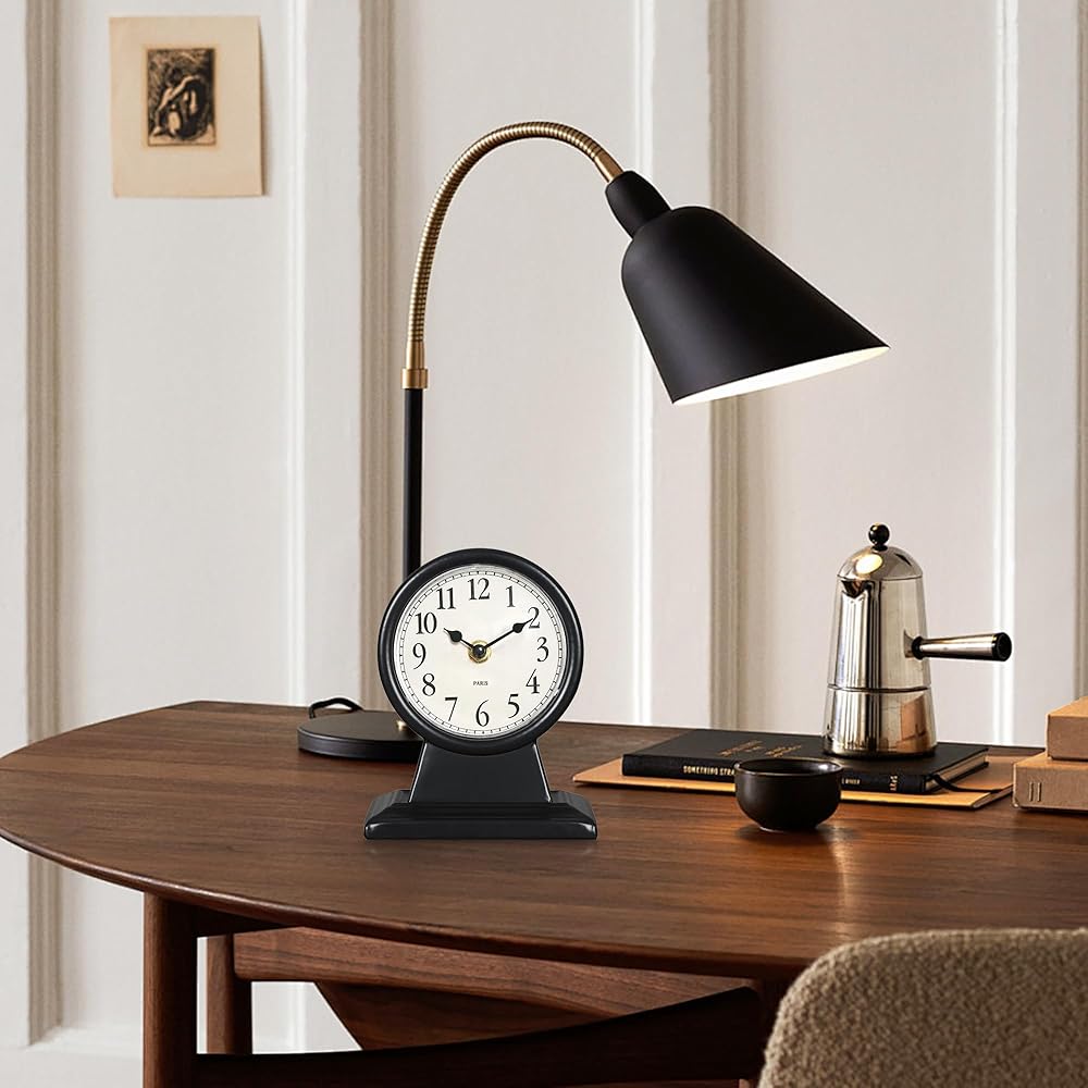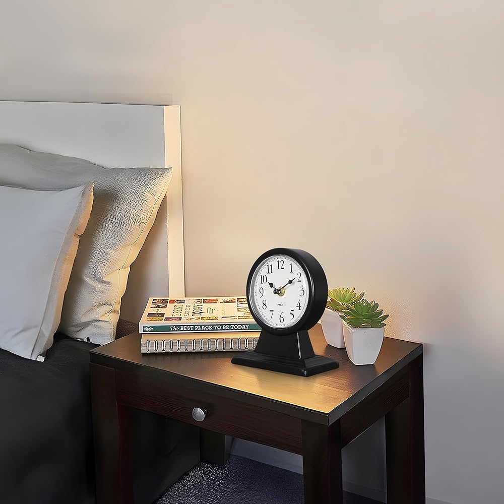 ساعة تناظرية بجانب السرير مقاس 6.7 بوصة، ساعة مكتب صغيرة قديمة تعمل بالبطارية، ساعة طاولة معدنية صامتة مزخرفة لديكور غرفة المعيشة، غرفة النوم، بجانب السرير، الرف (أسود)