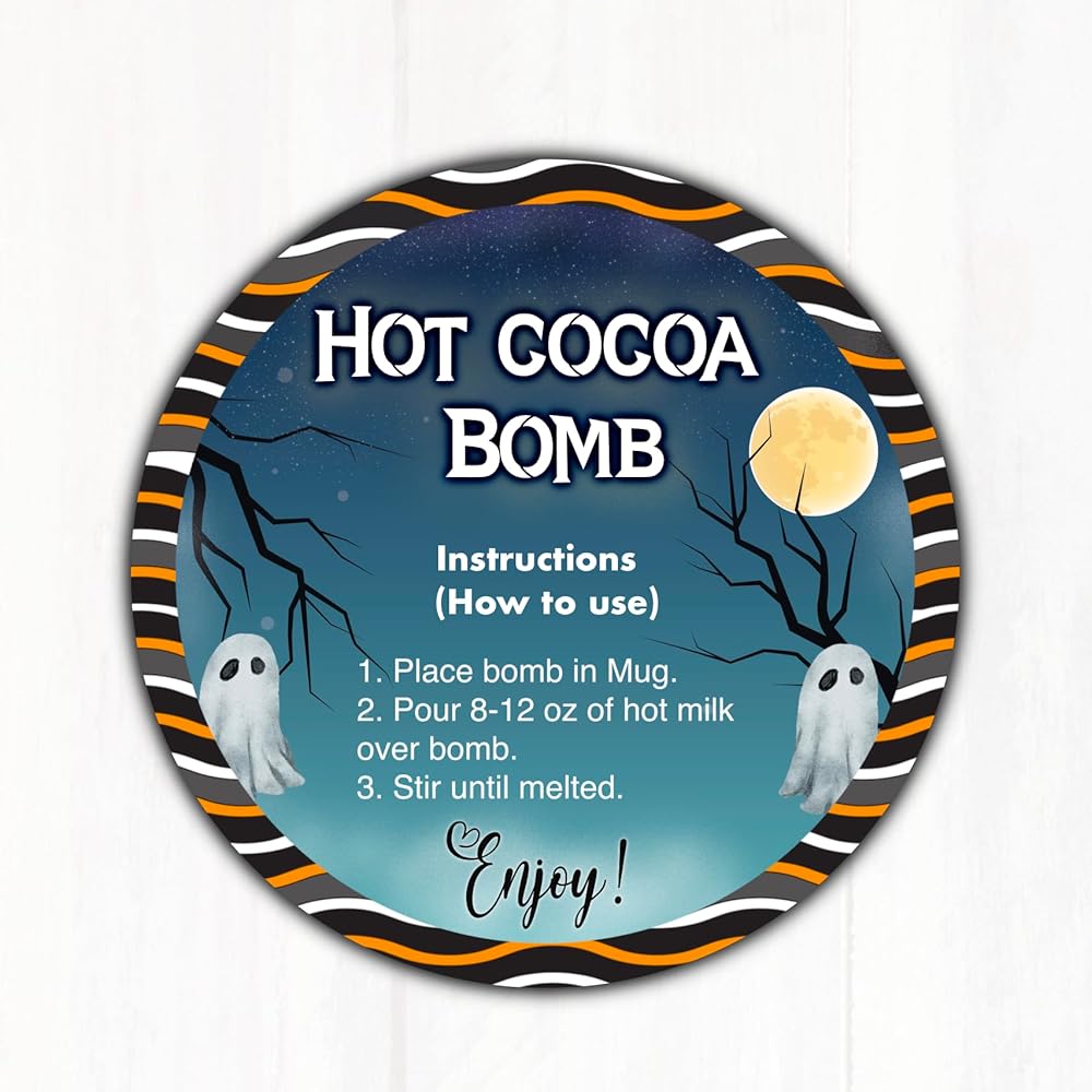 مجموعة من 100 ملصق / ملصق على شكل قنبلة الكاكاو الساخنة مقاس 2 بوصة مع تعليمات. هذه هي ملصقات تعليمات قنبلة الكاكاو الساخنة. يبلغ حجمها 5.08 سم ومطبوعة على ورق لاصق بلمسة نهائية غير لامعة. تعتبر ملصقات Hot Cocoa Bomb هذه مثالية لبائعي الحلوى / الحلويات محلي الصنع وتمثل ملصقًا مثاليًا لوضعه على منتجك النهائي. تتميز ملصقات قنبلة الكاكاو بتصميم مخيف للهالوين مع الأشباح. فقط قم بلصقها على العبوة الخاصة بك