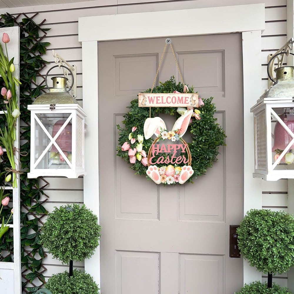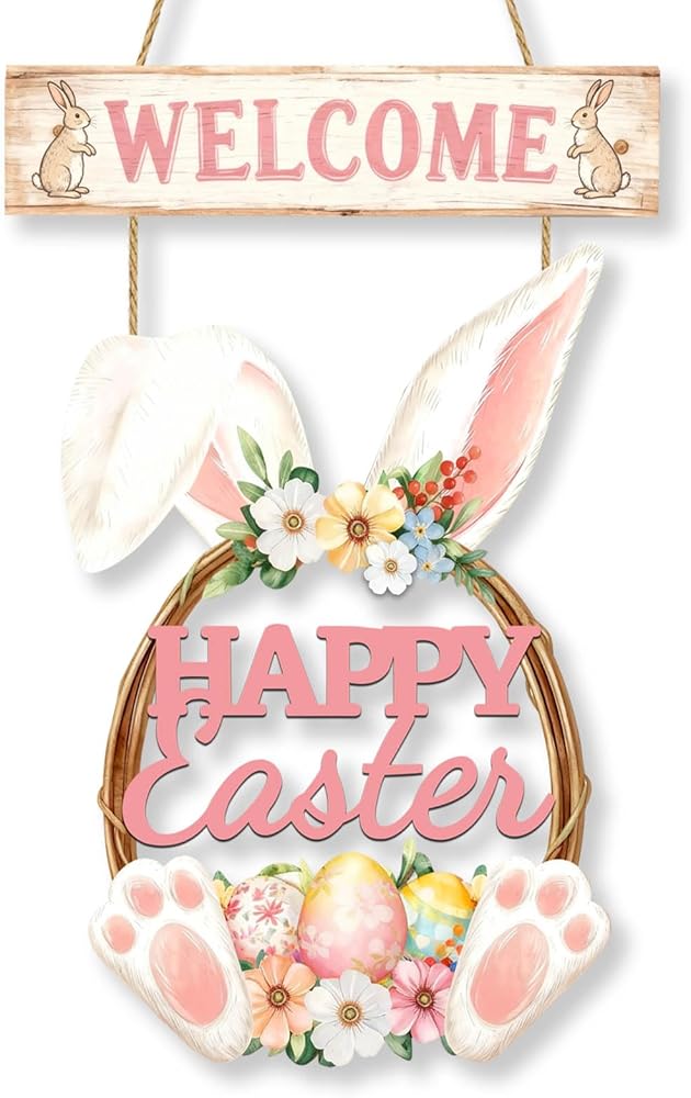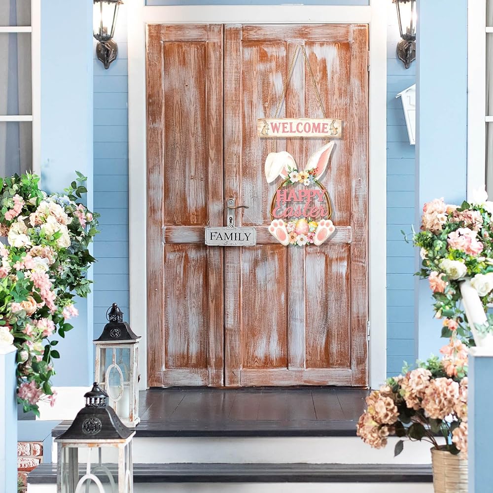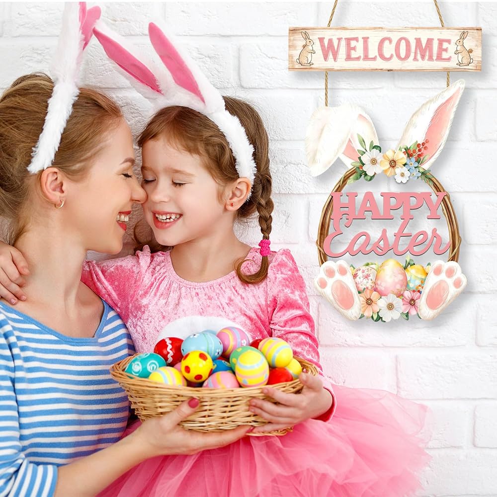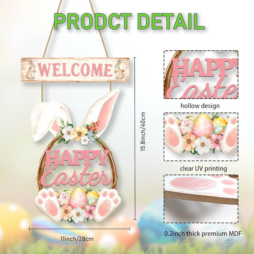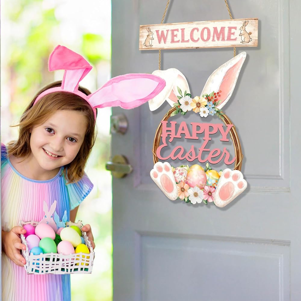 عيد الفصح الديكور اكليلا من الزهور الخشبية لديكور الباب الأمامي سعيد عيد الفصح علامة أرنب الربيع الديكور، الأرنب علامة زهرة البيض ترحيب شنقا علامات الجدار للمنزل جدار ديكور حزب في الهواء الطلق داخلي