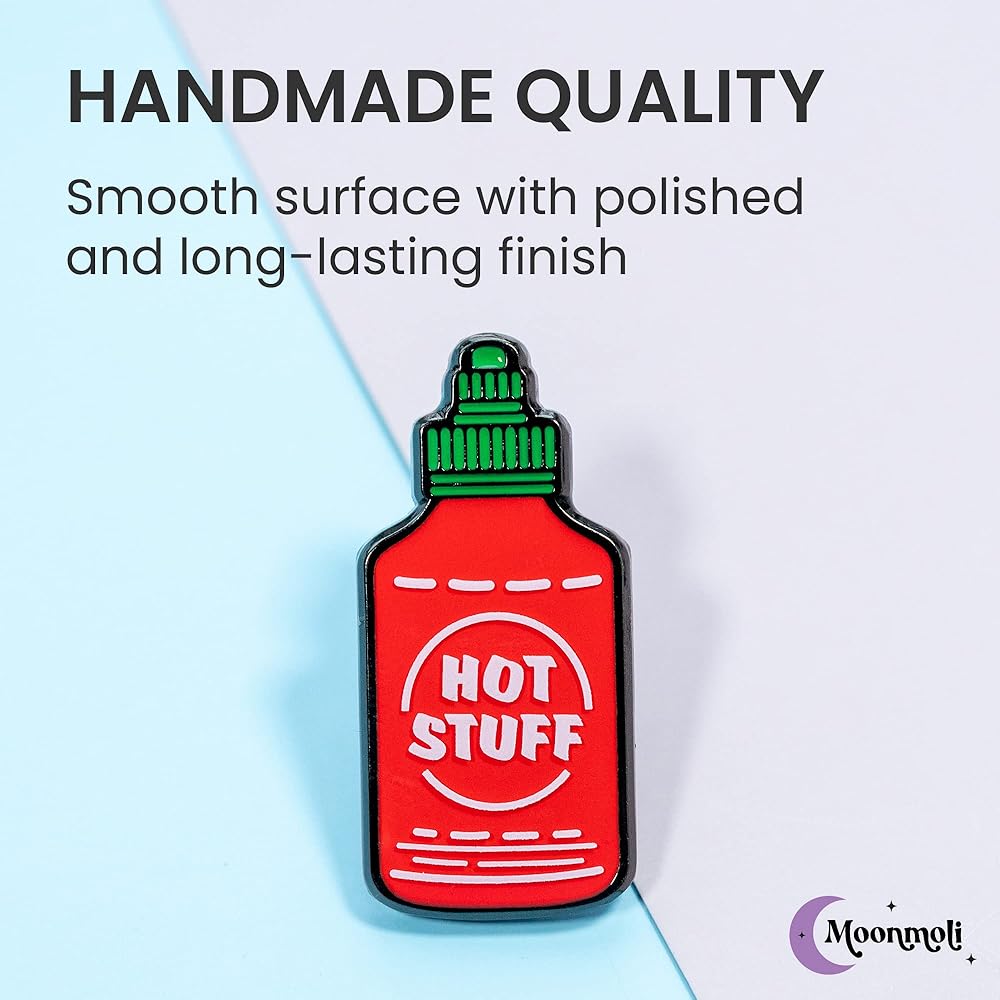 جودة مصنوعة يدويًا: تتميز دبابيس المينا الغذائية هذه على شكل زجاجة صلصة ساخنة بسطح أملس وطلاء راتينج مصقول يدوم طويلاً، مما يجعلها دبابيس جذابة وجمالية لأولئك الذين يقدرون التصميمات الرائعة والغريبة.