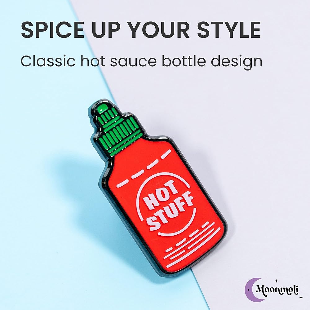 مع تصميم زجاجة صلصة حمراء حارة حارة وحروف "Hot Stuff" الجريئة باللون الأبيض الغامق، من المؤكد أن دبوس مينا الطعام هذا سيلفت الأنظار ويعطي انطباعًا أينما ذهبت. تحافظ دبابيسنا المطاطية الموثوقة على ثباتها في مكانها، مما يجعلها رائعة للاستخدام اليومي.