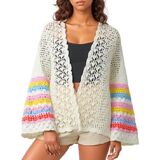 كارديجان كروشيه بأكمام جرس للنساء باللون الأبيض | سترة صوفية خفيفة الوزن من نسيج Pointelle ومفتوحة من الأمام | حجم ميدوم in Kuwait