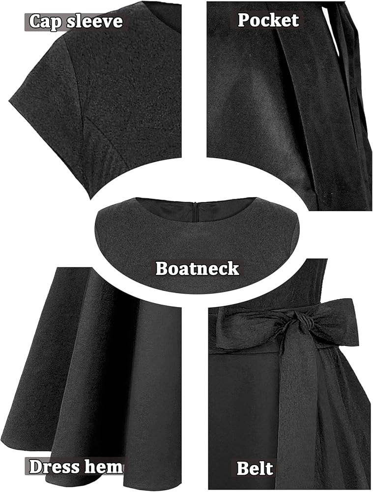 Vintage Design: Classic 1950s retro style cocktail dress featuring an elegant boatneck neckline, feminine cap sleeves, concealed back zipper, convenient side pockets, a detachable sash, full swing skirt capturing the classic Audrey Hepburn style perfect for 50s retro party themes
