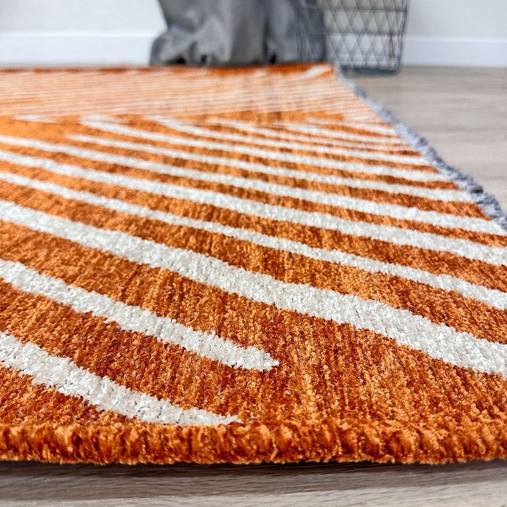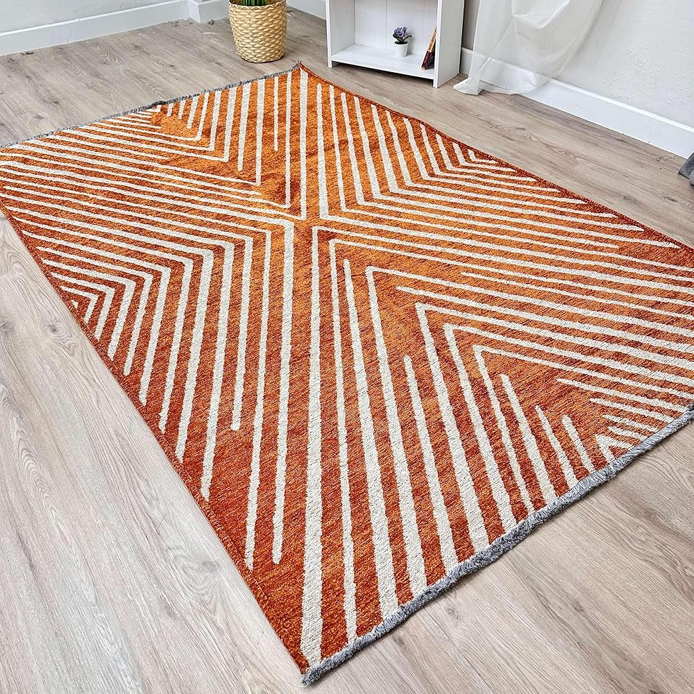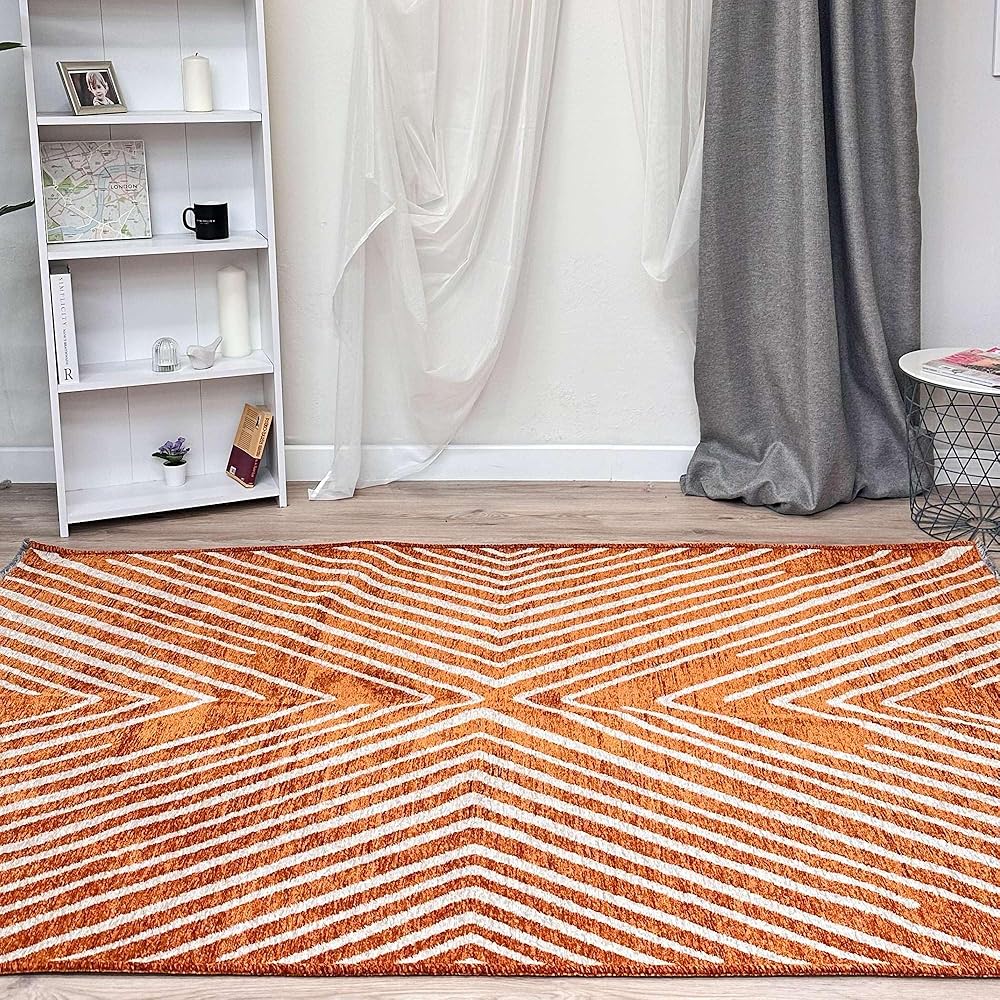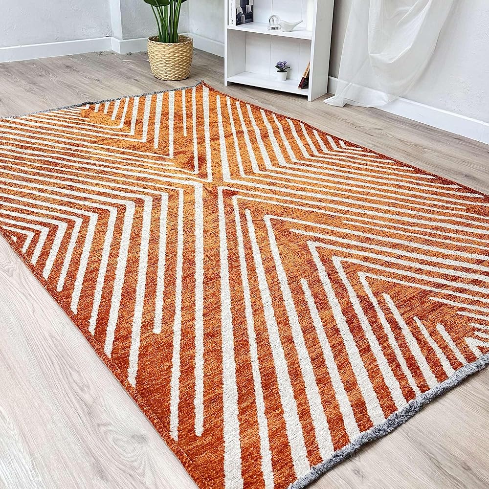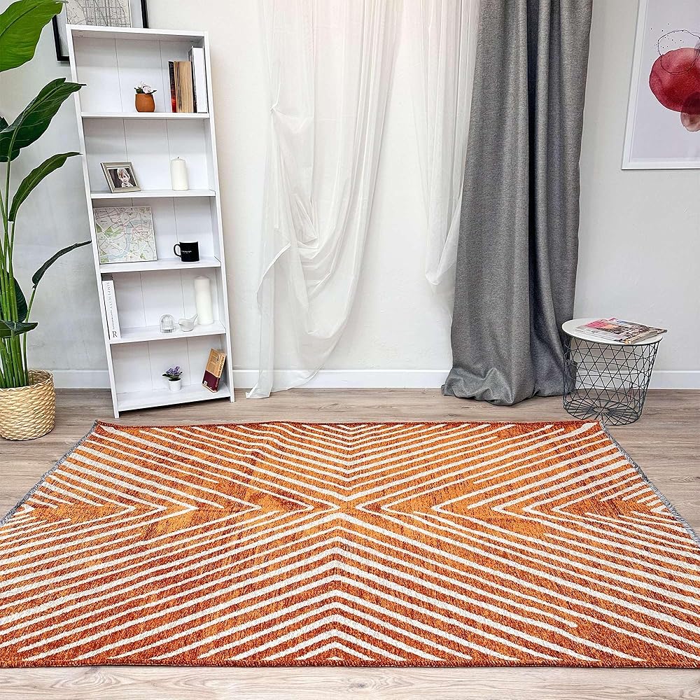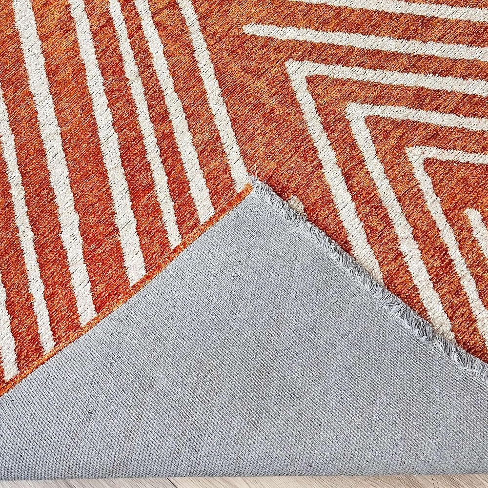 سجاد Alfa Rich 3x5 هندسي برتقالي أوف وايت مصنوع من القطن، صديق للحيوانات الأليفة، سهل التنظيف، ناعم، قابل للطي وقابل للغسل في الغسالة، لكننا نوصي بغسيل الملابس للأحجام الكبيرة! سجاد منطقة Alfa Rich القابل للغسل منسوج، عديم الرائحة وخالي من الوبر. ولكن انتظر، هناك المزيد! تتميز سجاد منطقة Alfa Rich بوبر متوسط (0.50 بوصة).