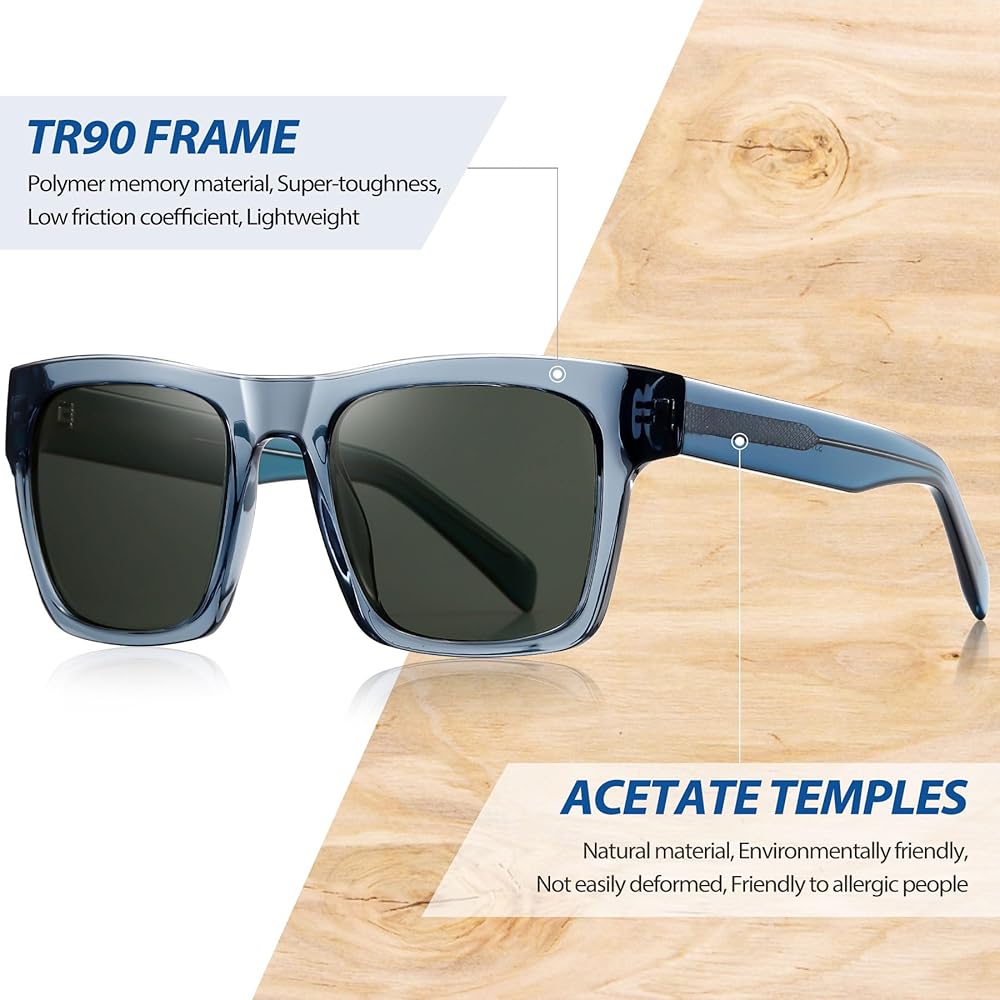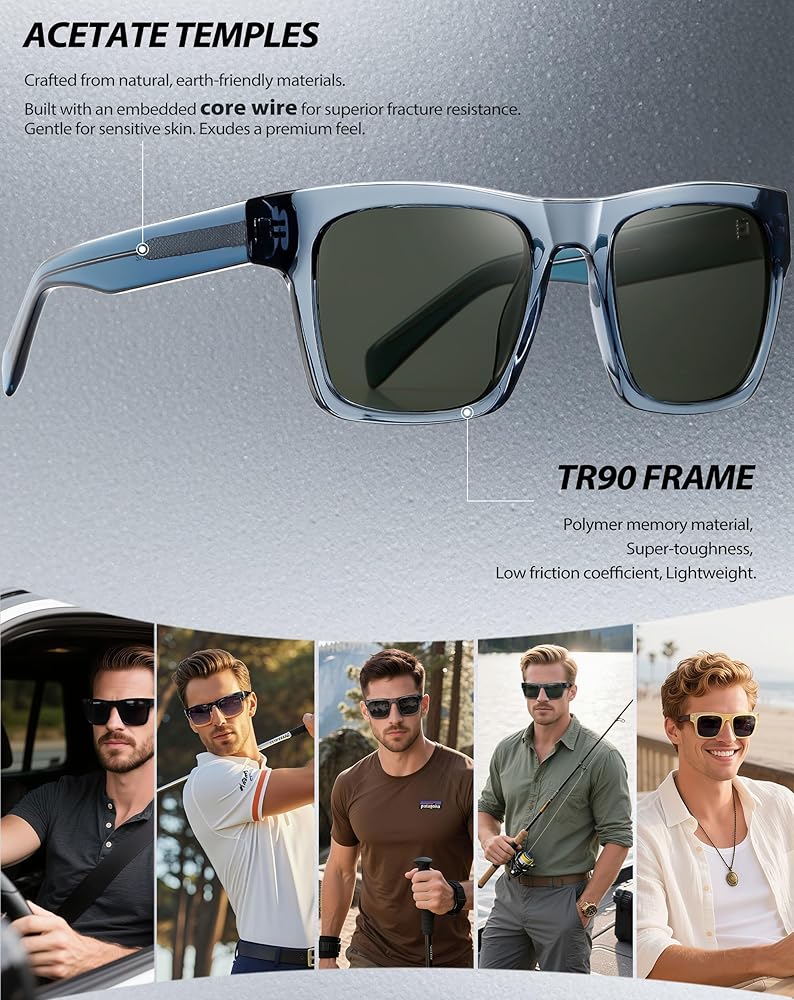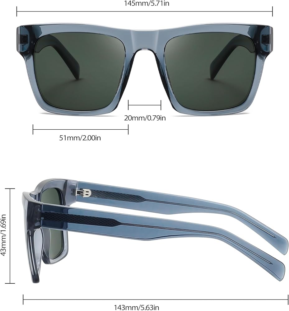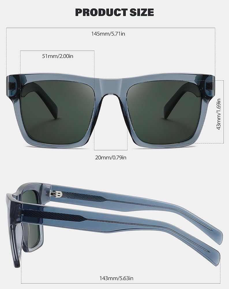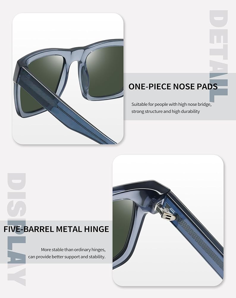 إطار كبير مربع الشكل: تمت ترقية النظارات الشمسية المربعة بناءً على التصميم الكلاسيكي. توفر الخطوط الواضحة والحادة للنظارات الشمسية الكبيرة إحساسًا بالحداثة والرقي. توفر النظارات الشمسية المصممة مظهرًا جريئًا ومنظمًا يمكنه تحسين ملامح وجهك بسهولة، مما يجعل وجهك يبدو أكثر تحديدًا وزاويًا. نظارات شمسية مستقطبة لا تتأثر بمرور الزمن تناسب أشكال الوجه المختلفة، وتحمي العينين مع إضفاء انطباعٍ أنيق