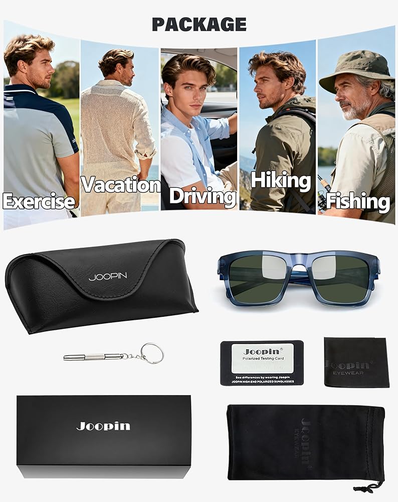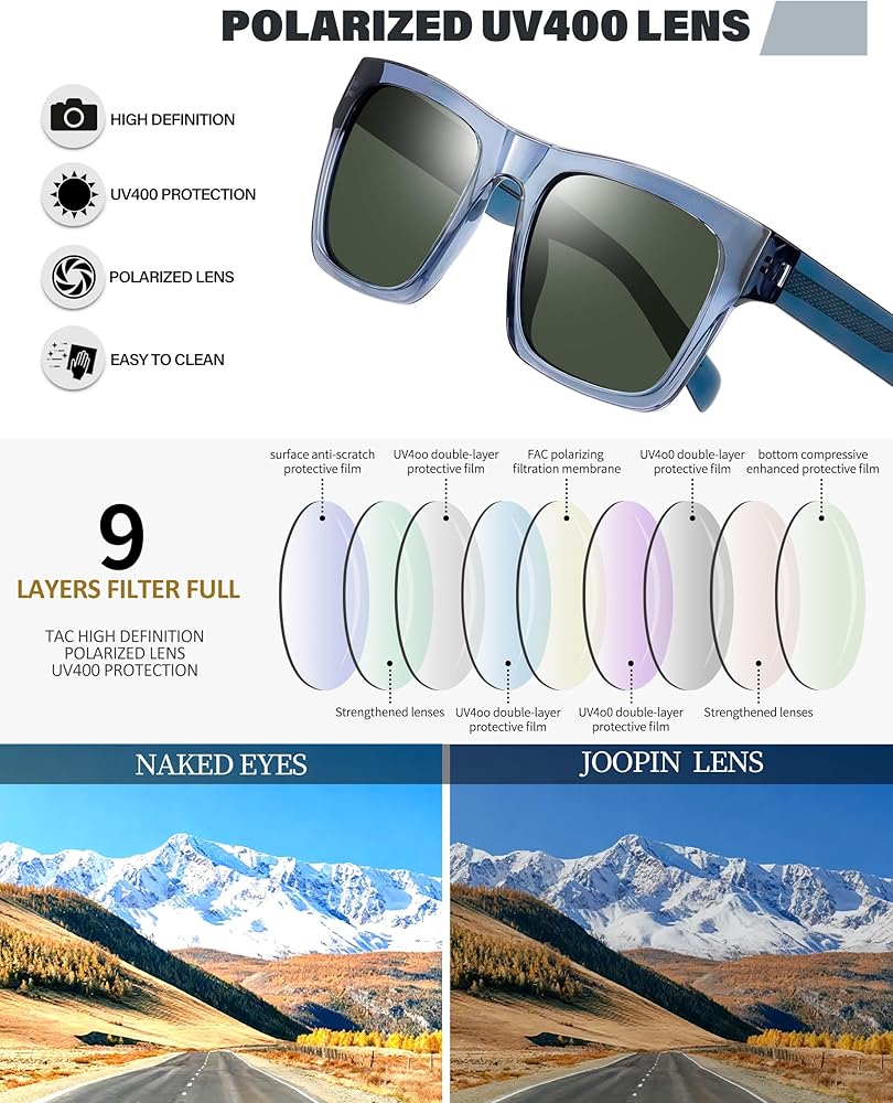 حماية مستقطبة من الأشعة فوق البنفسجية 400: نظارات Joopin غير التقليدية ذات العدسات المستقطبة عالية الدقة والخالية من الوهج تحتوي على فلتر غير مرئي يمنع الوهج من ضربك مباشرة في العين، مما يقلل من إجهاد العين وعدم الراحة في ضوء الشمس الساطع. توفر لك النظارات الشمسية بنسبة 100% من الأشعة فوق البنفسجية 400 حماية كاملة ضد الأشعة فوق البنفسجية الضارة، وتحجب الأشعة فوق البنفسجية فئة A والأشعة فوق البنفسجية فئة B. تعتبر النظارات الشمسية الداكنة مثالية للجري والقيادة وصيد الأسماك والمشي لمسافات طويلة والجولف وما إلى ذلك. سوف يقدم لك Joopin مفاجآت أكثر من غيرها