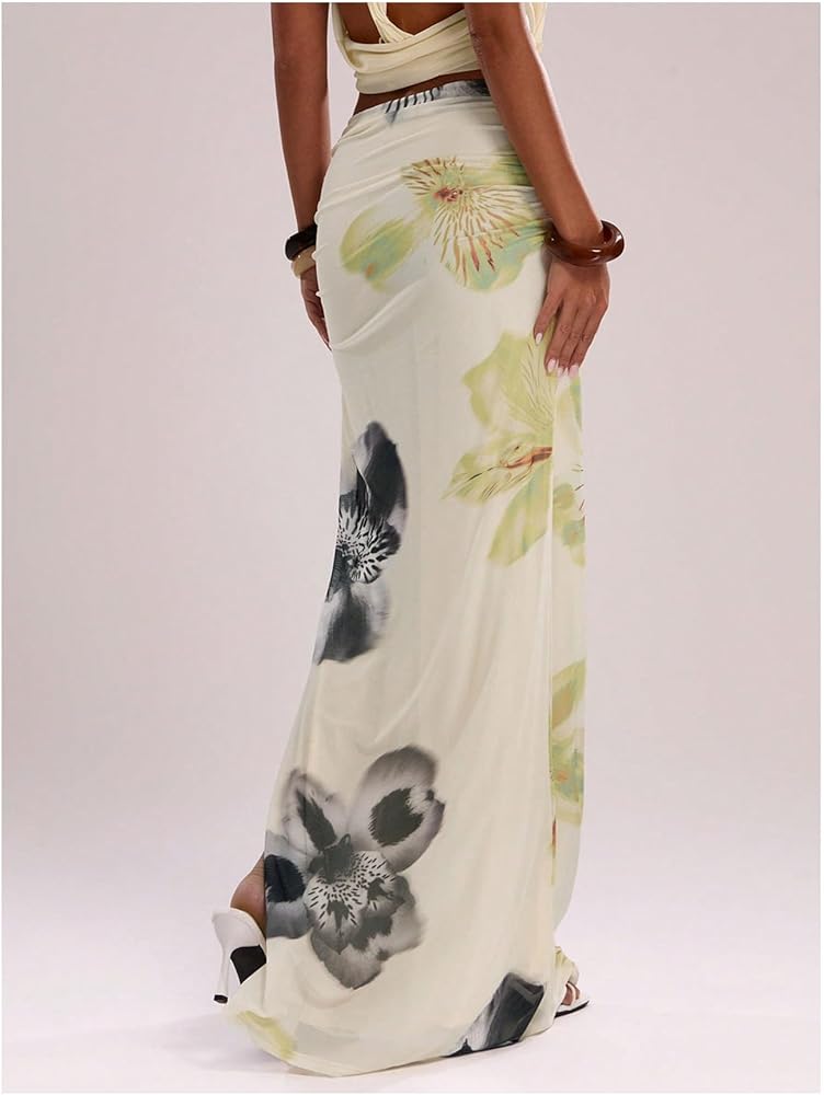 • Ruched bodycon skirt, floral mesh maxi skirt, low waist draped skirt