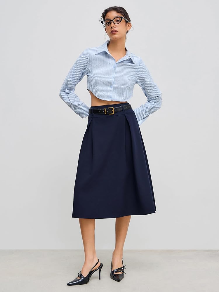 طول طويل أنيق بكسرات: تتميز هذه التنورة بطول طويل أنيق، وتضيف لمسة من الرقي إلى أي ملابس، مما يجعلها مناسبة للمناسبات غير الرسمية والرسمية. يضيف التصميم المطوي نسيجًا وحركة، مما يعزز المظهر الجمالي العام للتنورة