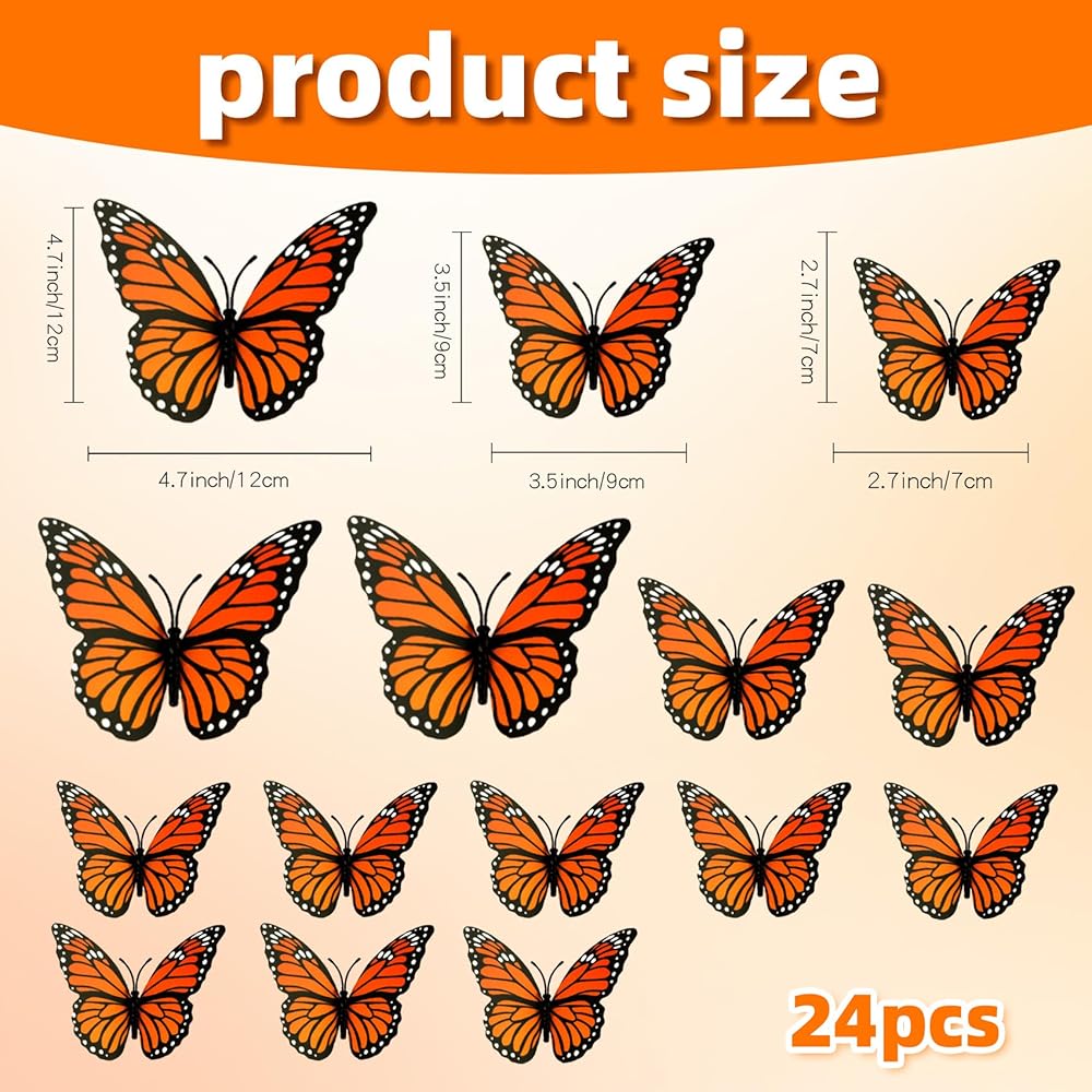 You will receive 24 monarch butterfly decorations, a quantity sufficient to meet your daily or various festival decoration needs for different venues, and also enough to share with your family and friends