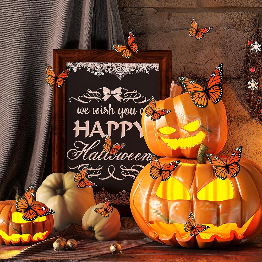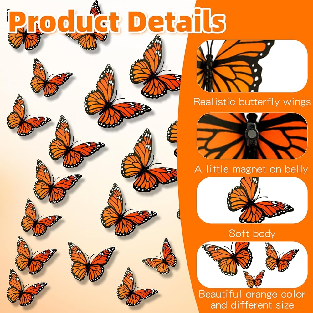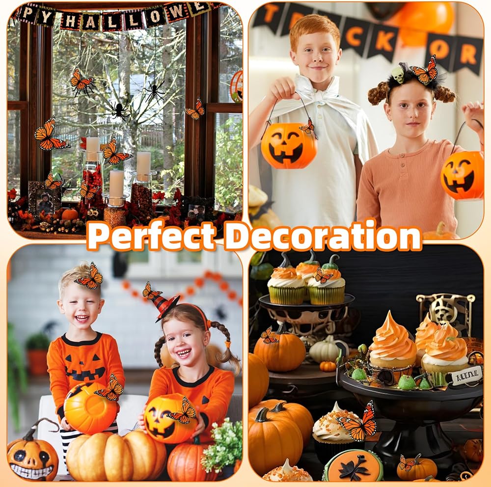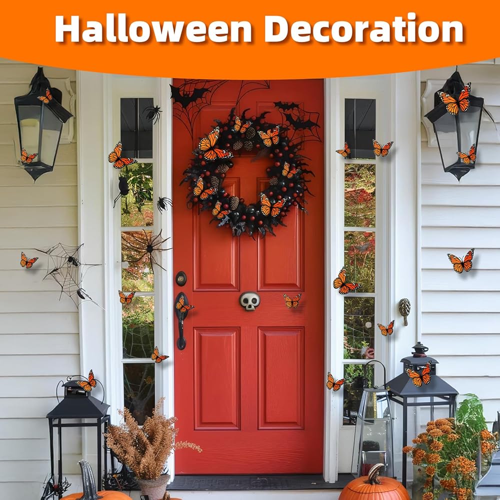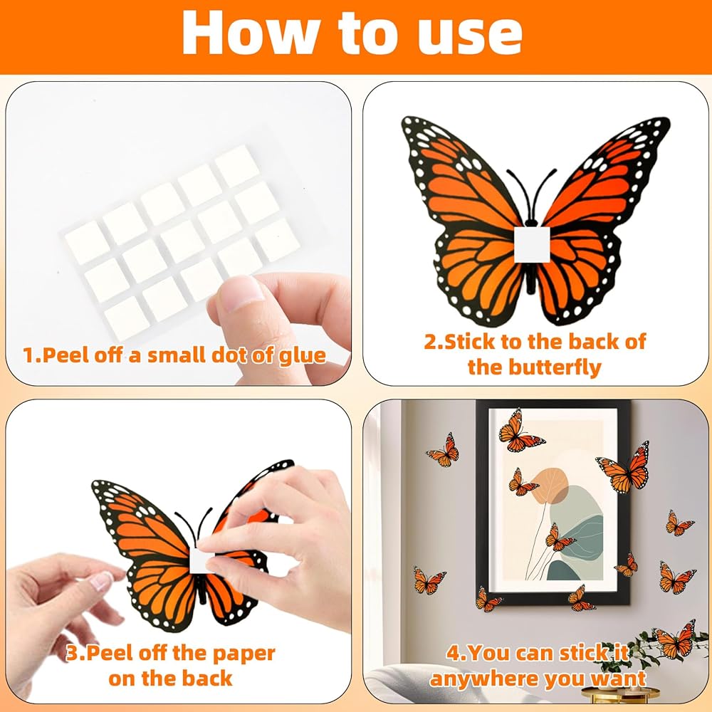 The 3D Monarch Butterfly is easy and convenient to use, without the need for complicated installation steps. Just tear off the double-sided stickers and stick them on the back of the butterfly decoration. Then you can stick them on the surface of any item you want to decorate. You can freely combine and match them according to your personal preferences and creativity to create a unique Halloween decoration style