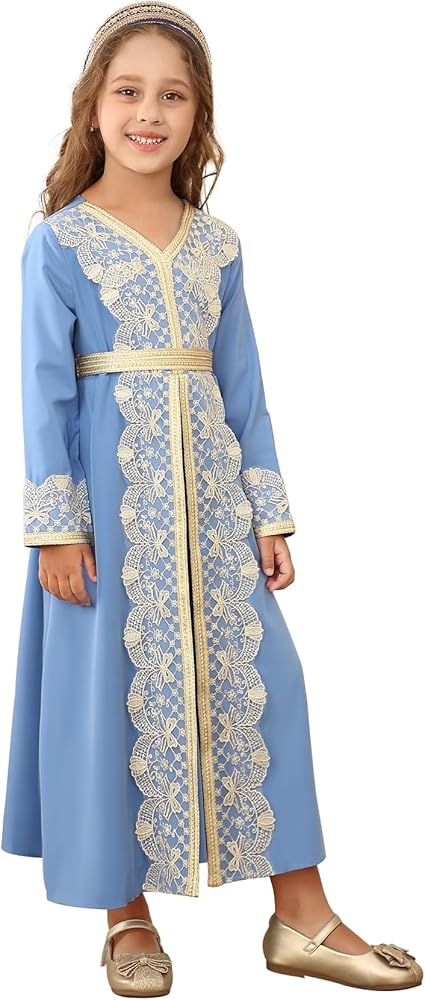 • التصميم: يتميز فستان الصلاة الإسلامي ذو الأكمام الطويلة بحزام لمساعدة فتاتك على خلق مظهر بسيط ومحافظ. الرداء الرمضاني بأكمام واسعة ورقبة على شكل حرف V أنيق وممتع من الناحية الجمالية، ويطيل الرقبة بصريًا. ويتميز الفستان أيضاً بتطريزات معقدة مع أنماط زهرية وهندسية معقدة، ومطرزة بخيوط ذهبية على قماش أزرق، مما يخلق تأثيراً بصرياً فاخراً وأنيقاً.