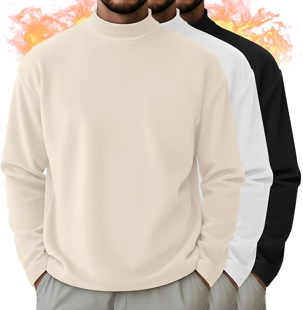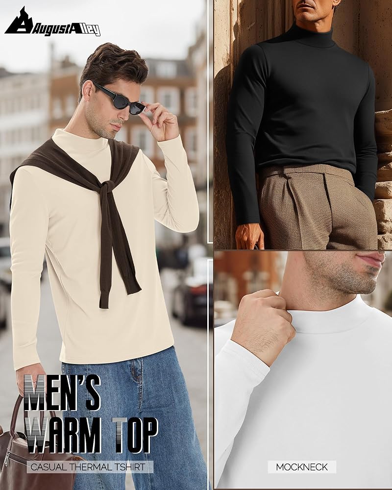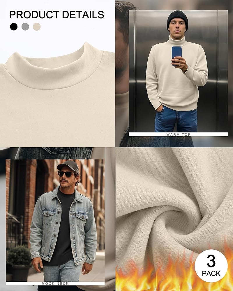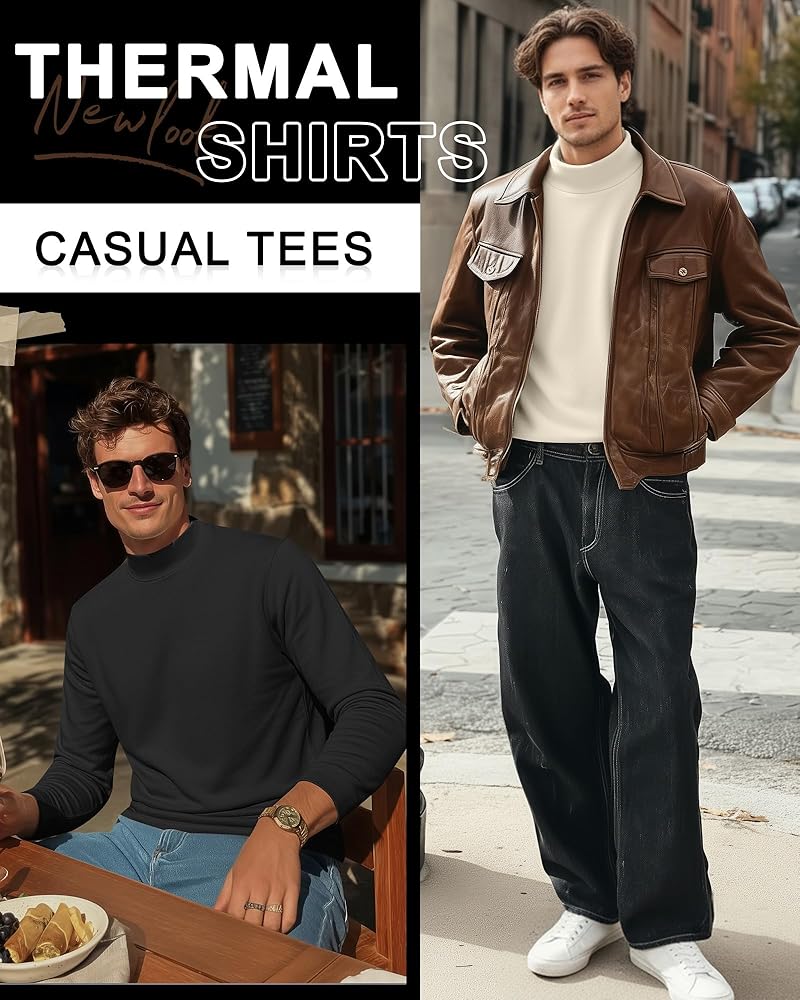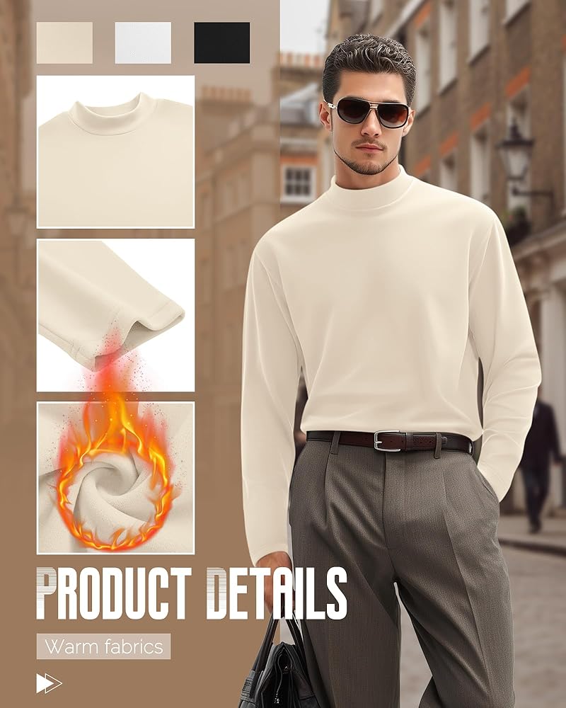 تصميم تفصيلي: تتميز القمصان الحرارية للرجال بتصميم ياقة مدورة وهمي. يمكنك طيها لأسفل أو تركها تغطي رقبتك بالكامل عندما يكون الجو باردًا جدًا ولا تريد رفع منظم الحرارة. يجب أن تكون في خزانة ملابسك للأيام الباردة