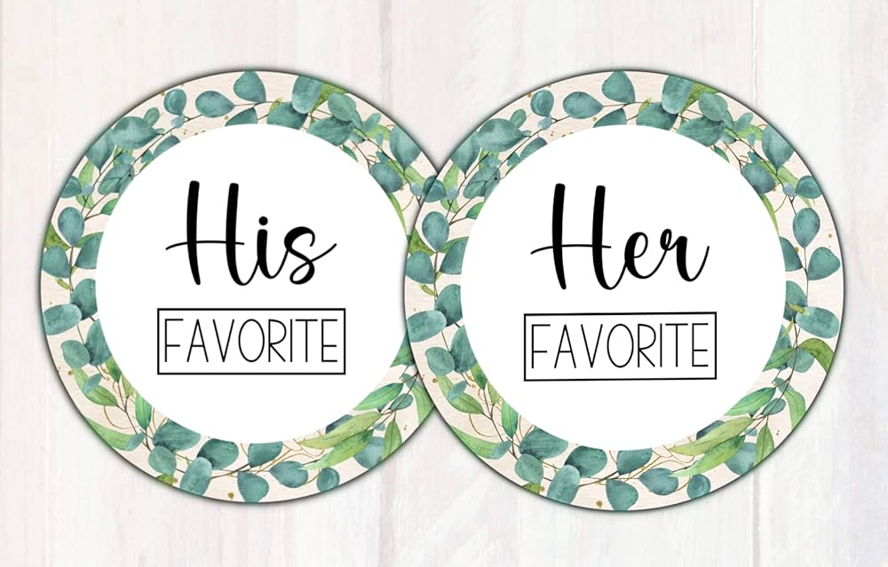 ملصقات الملصقات المفضلة له ولها للوجبات الخفيفة المفضلة لحفلات الزفاف - ملصقات مفضلة لها المفضلة لها من نباتات الأوكالبتوس الخضراء المفضلة لحفلات الزفاف، مجموعة من 100 ملصق دائري مقاس 5 سم