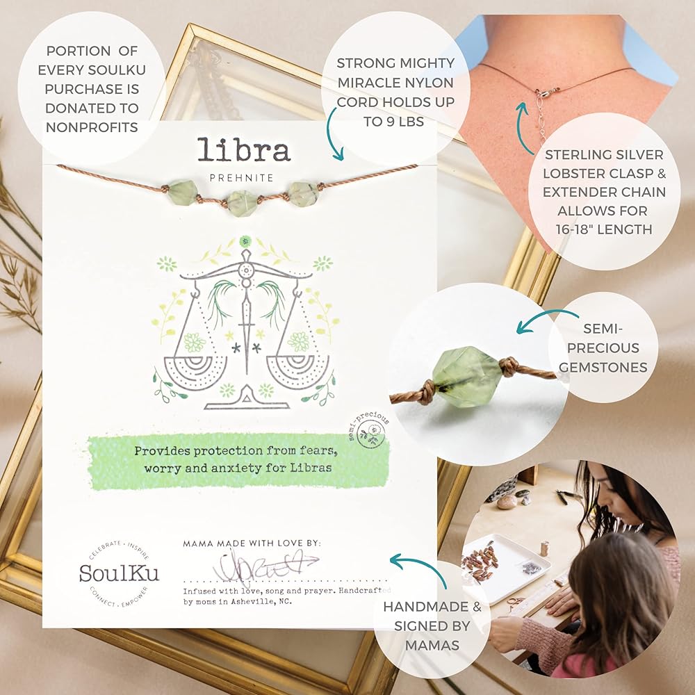 قلادة حجر زودياك من SoulKu، مجوهرات علم التنجيم مع كريستال شفاء، قلادة برجك للنساء الأقوياء، الأم والأخت، سلك 40.64 سم مع موسع من الفضة الإسترلينية 2 بوصة (بريهنيت، الميزان)