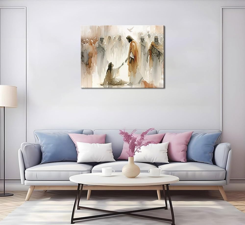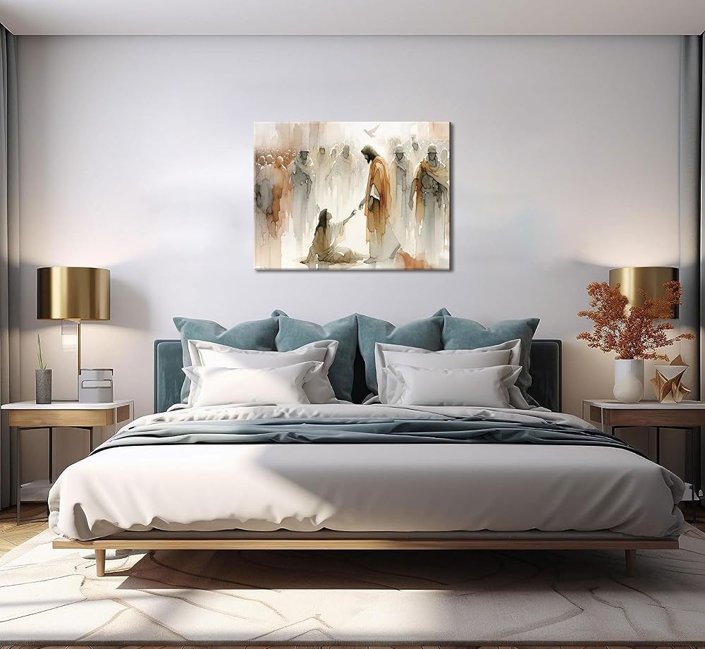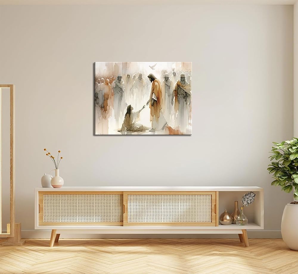 عمل فني ملهم: لوحة فنية جدارية من القماش "يسوع يشفي المرأة" تصور اللحظة القوية عندما تلمس المرأة حاشية تنورة يسوع، لتكون بمثابة تذكير جميل بالإيمان والشفاء في مساحة معيشتك.