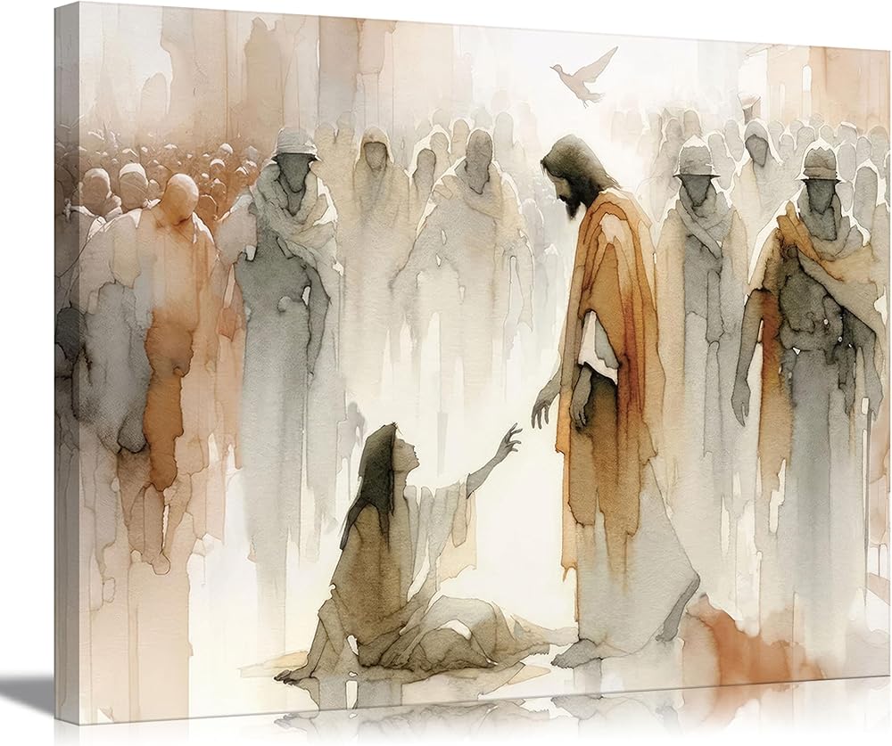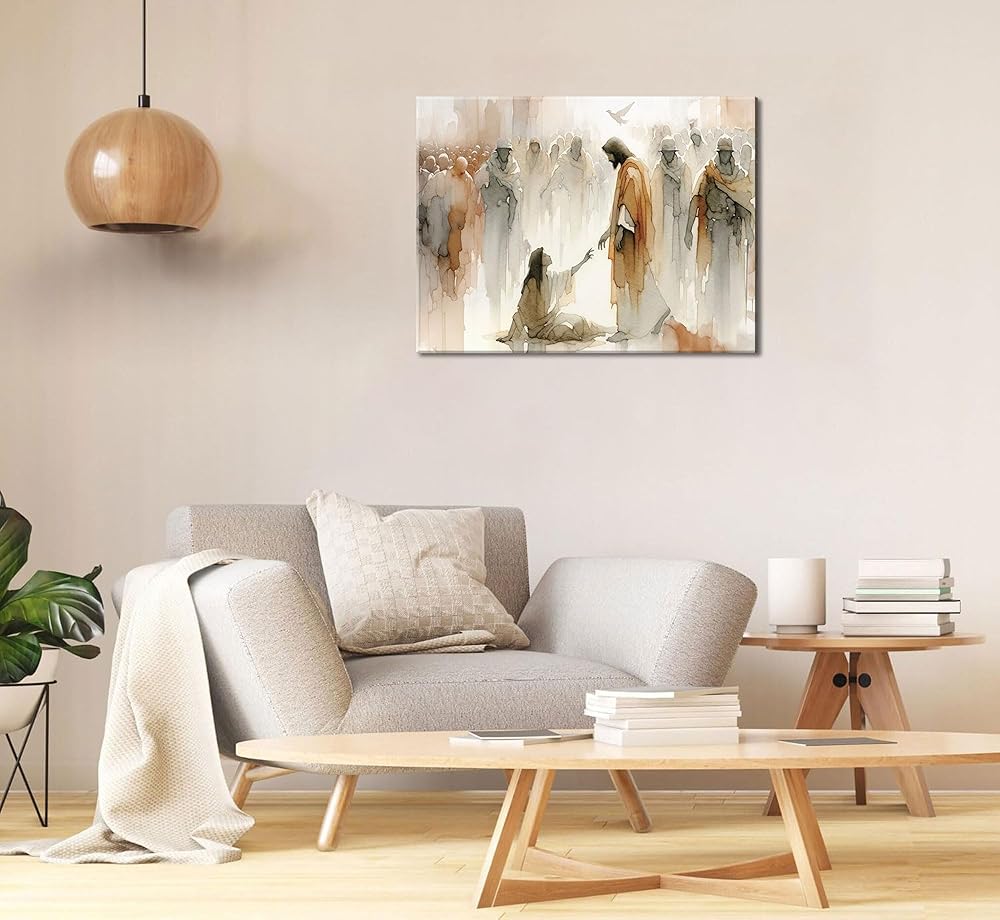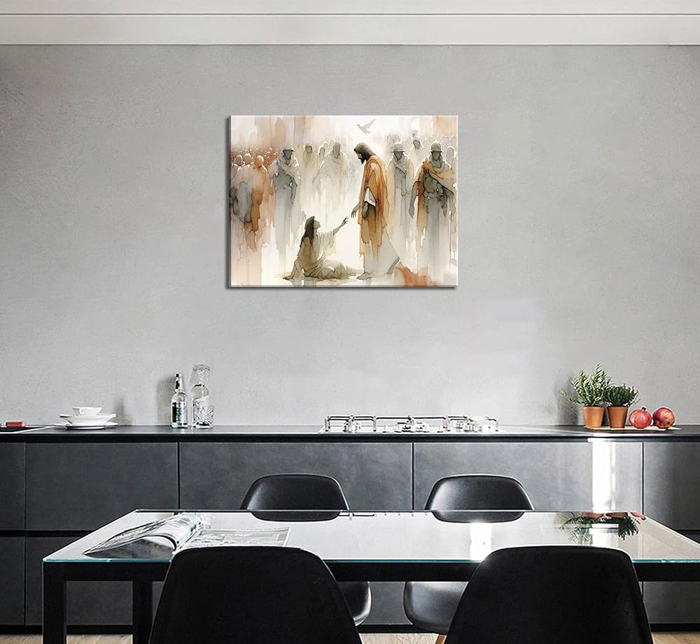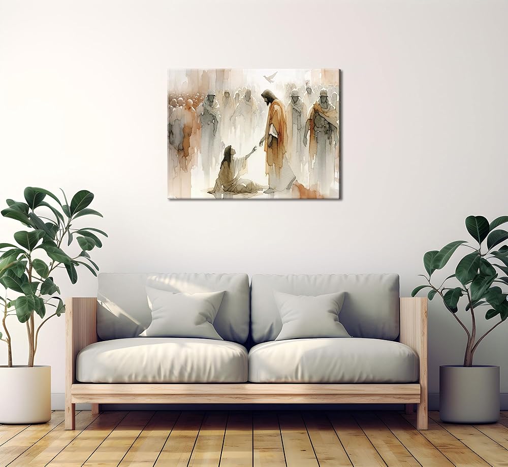 عمل فني ملهم: لوحة فنية جدارية من القماش "يسوع يشفي المرأة" تصور اللحظة القوية عندما تلمس المرأة حاشية تنورة يسوع، لتكون بمثابة تذكير جميل بالإيمان والشفاء في مساحة معيشتك.