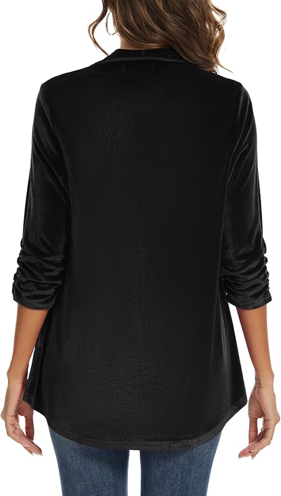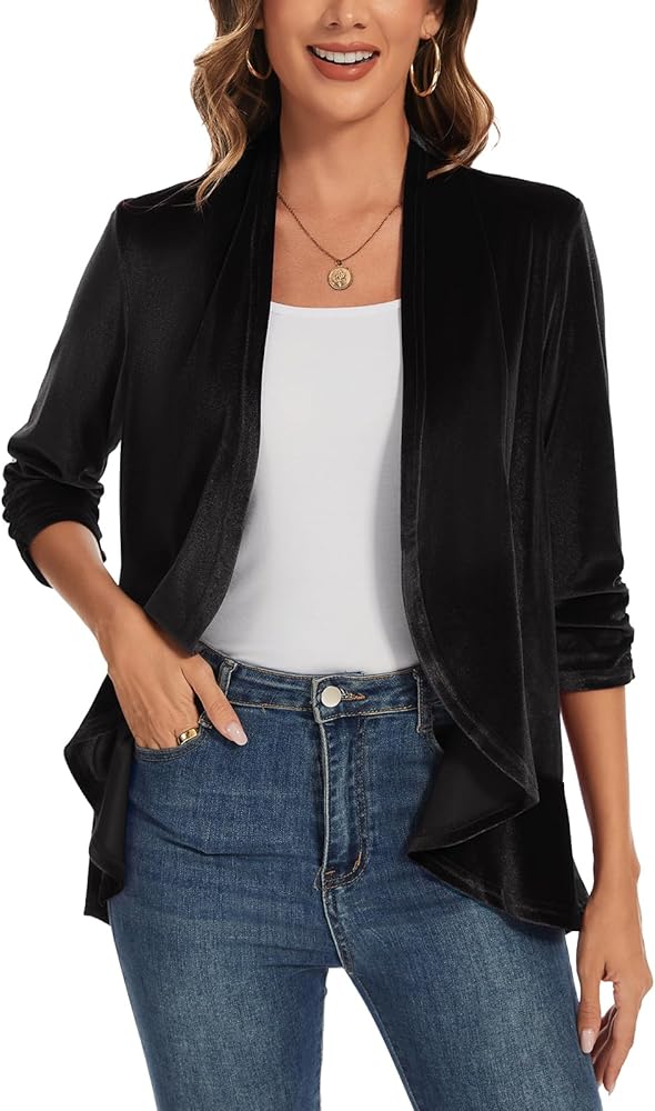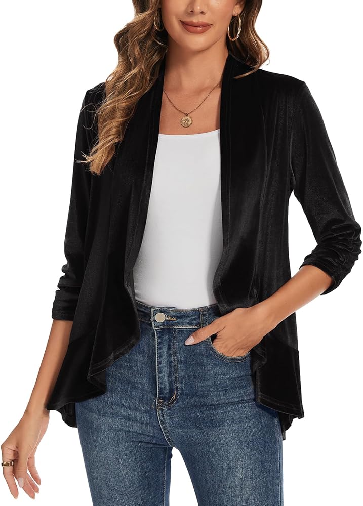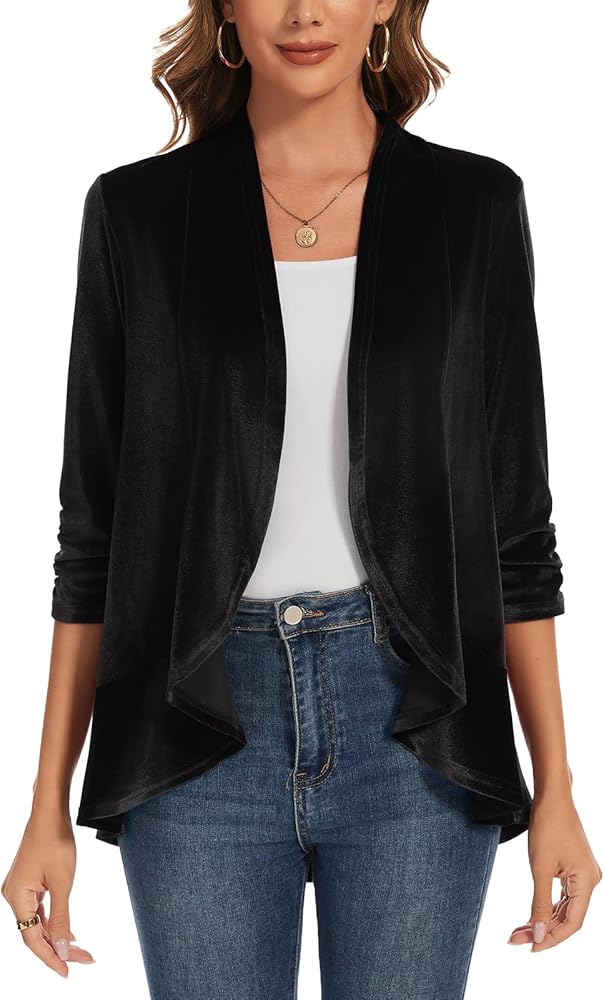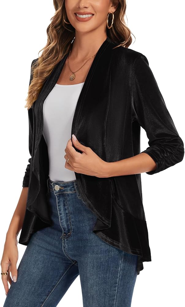 ✿المميزات: سترة مخملية LADI TREND للسيدات تتميز بأكمام مكشكشة 3/4، وحاشية مكشكشة، وسترة مخملية مفتوحة من الأمام، بدون ياقة، لون ثابت. تناسب معظم إطارات الجسم، مما يوفر مظهرًا جذابًا ولمسة من الأناقة.