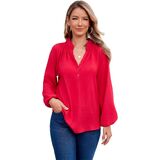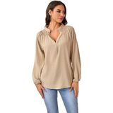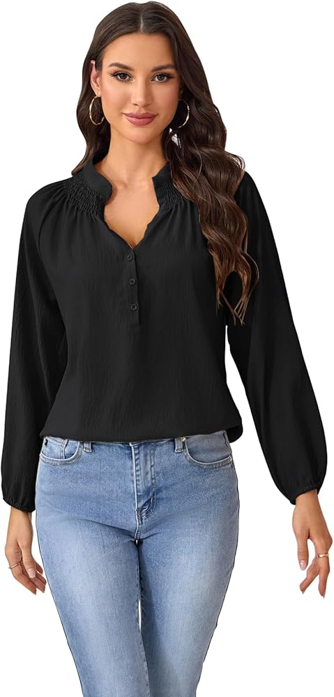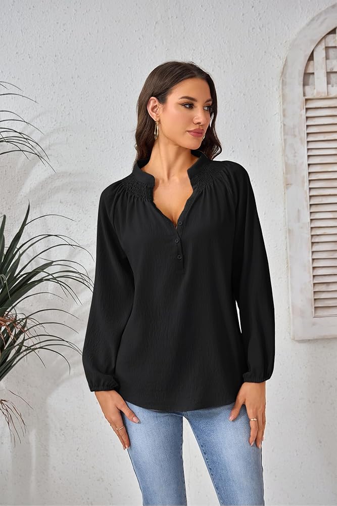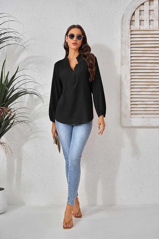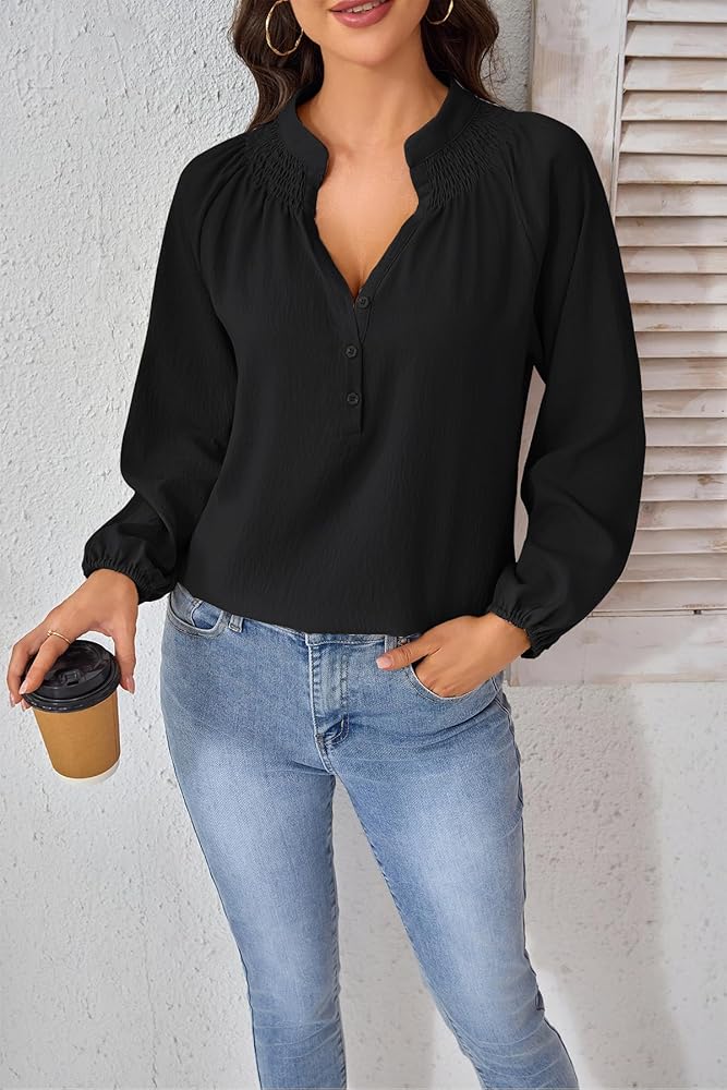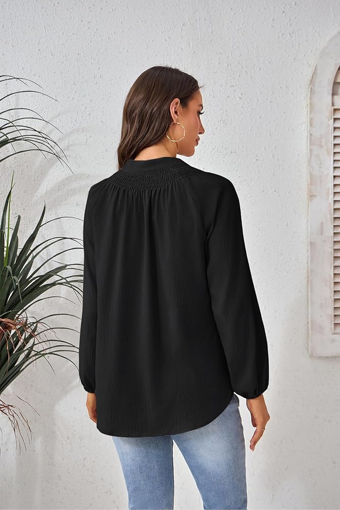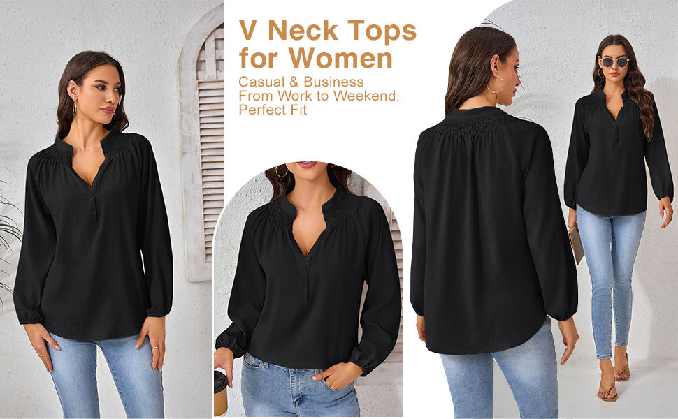 رقبة على شكل حرف V أنيقة مع تفاصيل أزرار سفلية: تتميز البلوزات النسائية ذات الأكمام الطويلة بخط رقبة على شكل حرف V جذاب مع أزرار دقيقة، مما يضيف الرقي والتنوع لمظهرك.