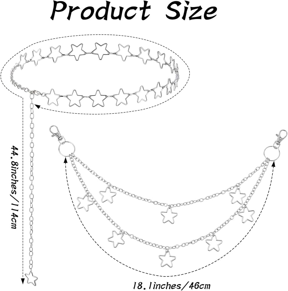 Xindojuz 2 قطعة حزام الخصر نجمة، حزام سلسلة البطن الفضية قابل للتعديل الجينز المعادن الغربية السراويل جيب الشرير الهيب هوب سلاسل المحفظة للنساء الرجال الجسم سلسلة البطن القوطي Y2K الملحقات