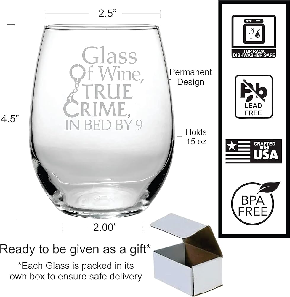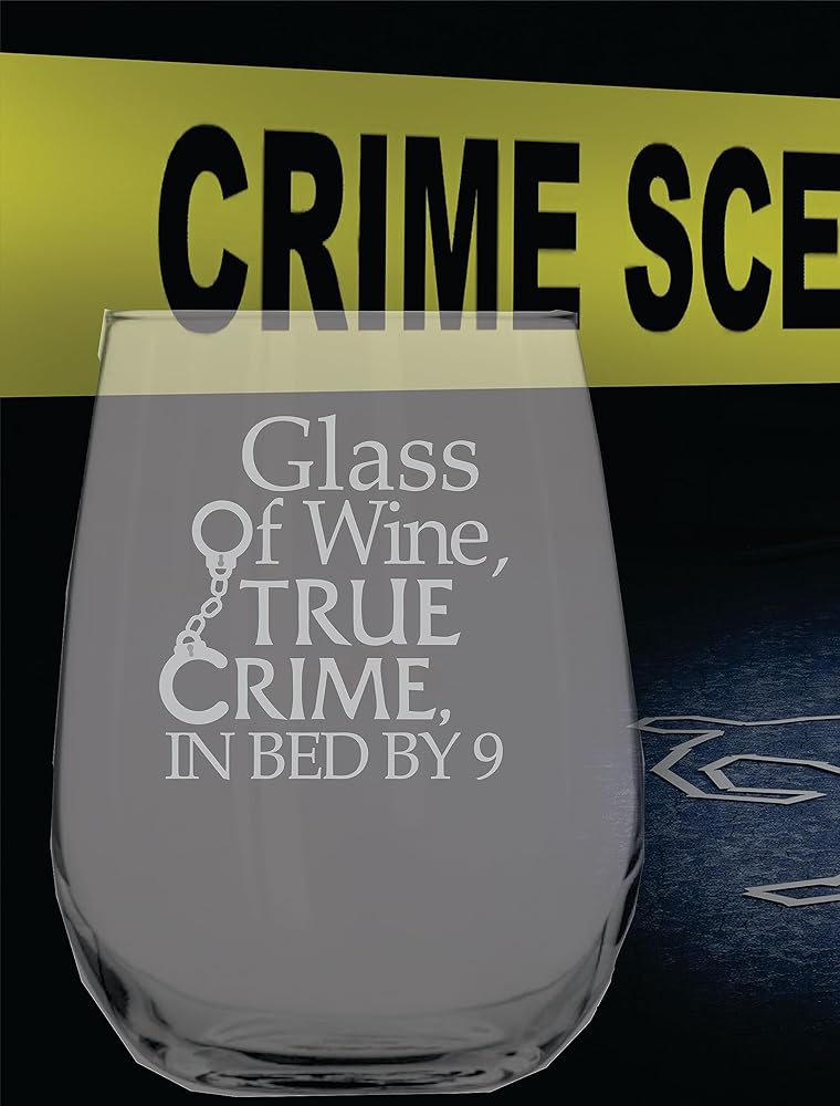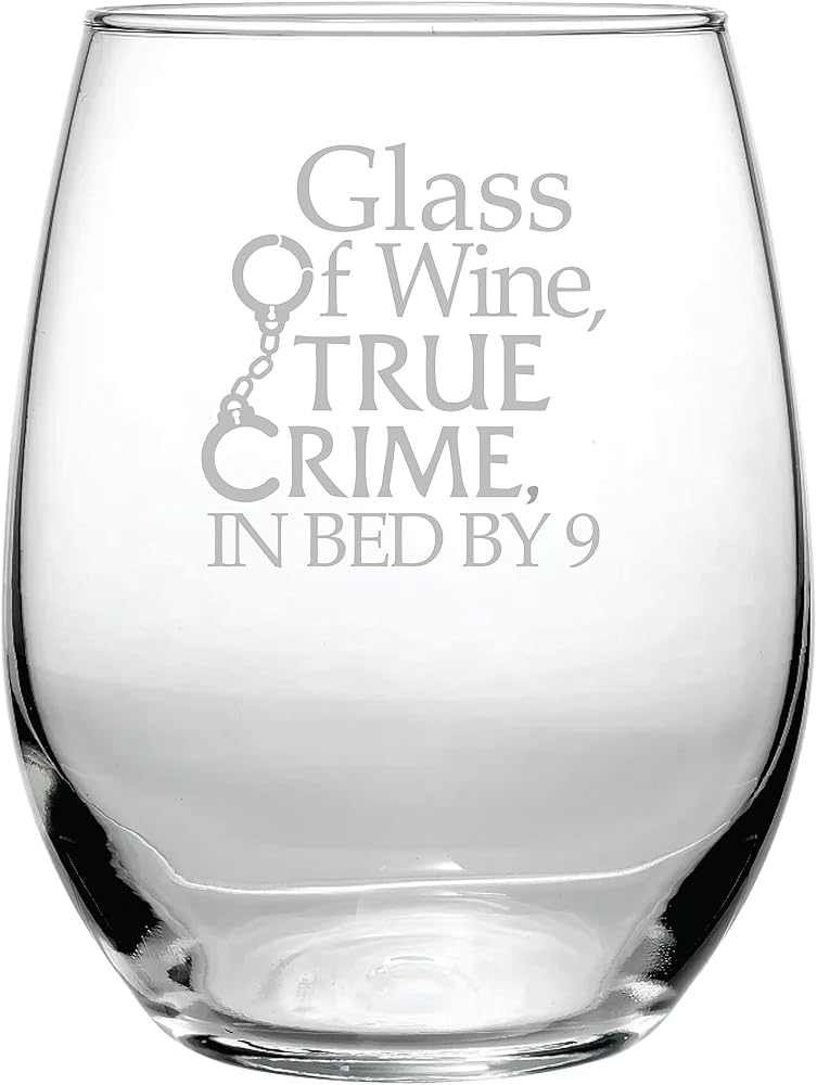 ★ TRUE CRIME, GLASS OF WINE, IN BED BY 9 - sounds like a criminally perfect night! Our 15 oz stemless glass is an ideal gift for a best friend, sister, coworker or family member that is obsessed with murder mysteries or an unsolved crime podcasts junkie. Pair with a true crime book or favorite tv show and pour some wine for a killer night in