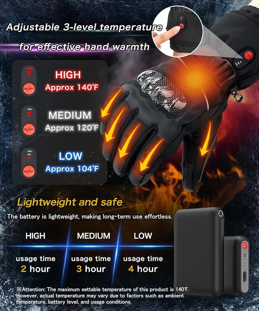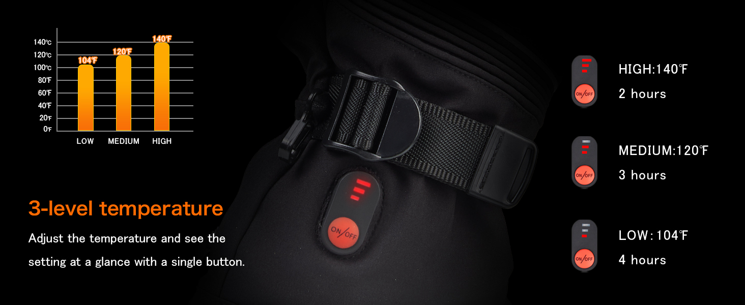 • 【3 إعدادات للتدفئة】مصممة بثلاثة مستويات حرارة قابلة للتعديل، تتيح لك هذه القفازات الكهربائية الساخنة اختيار الدفء المناسب لنشاطك. ما عليك سوى الضغط لفترة طويلة للتشغيل والضغط لفترة قصيرة لتبديل الأوضاع. اضغط على الزر للتبديل بسهولة بين 3 مستويات لدرجة الحرارة - عالية (60-65 درجة مئوية/140-149 درجة فهرنهايت)، متوسطة (50-55 درجة مئوية/122-131 درجة فهرنهايت)، ومنخفضة (40-45 درجة مئوية/104-113 درجة فهرنهايت)، تدوم لمدة 2-2.5 ساعة، 3-3.5 ساعة، 4-4.5 ساعات على التوالي.