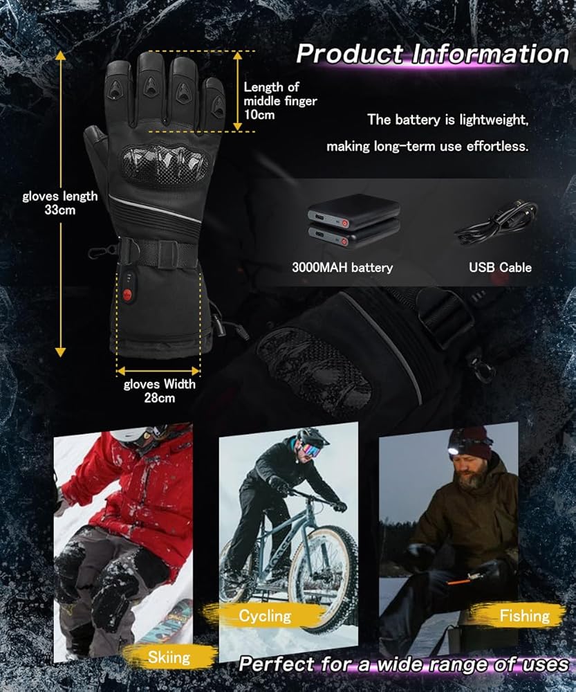 • 【قفازات ساخنة قابلة لإعادة الشحن】يتم تشغيل القفازات الساخنة بزوج من البطاريات القابلة لإعادة الشحن بقوة 7.4 فولت 3000 مللي أمبير في الساعة وتأتي مع شاحن USB، والذي يمكنه تسخين يديك في ثوانٍ وتوفير دفء طويل الأمد. قفازات التدفئة مع عناصر تسخين مطورة تغطي الجزء الخلفي من اليد بالكامل، بما في ذلك أطراف الأصابع والفجوات، مما يجعلها أكثر دفئًا من قفازات التدفئة العادية المتوفرة في السوق. تم تصميم هذه القفازات الكهربائية للحفاظ على راحة يديك في أبرد الظروف.