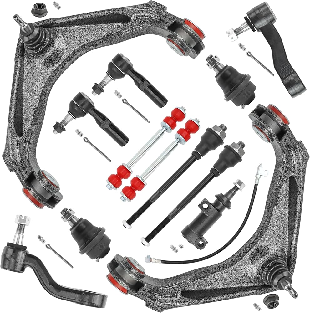 قائمة المنتجات:، 2x ذراع التحكم العلوي الأمامي + وصلة كروية مجمعة مسبقًا - K620054PU، 2x وصلة كروية سفلية أمامية - K6693، 2x وصلة نهاية قضيب التأرجح الأمامي - K80631PU، 1x ذراع بيتمان التوجيه الأمامي - K6654 [مع 3 أخاديد/خدد]، 1x ذراع التباطؤ الأمامي - K6535، 2x أطراف قضيب ربط خارجي أمامي - ES3609، 2x أمامي داخلي نهايات قضيب التعادل - ES3488
