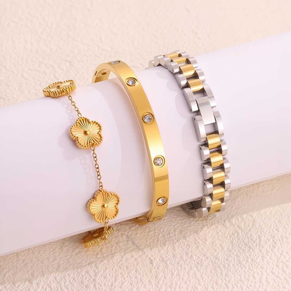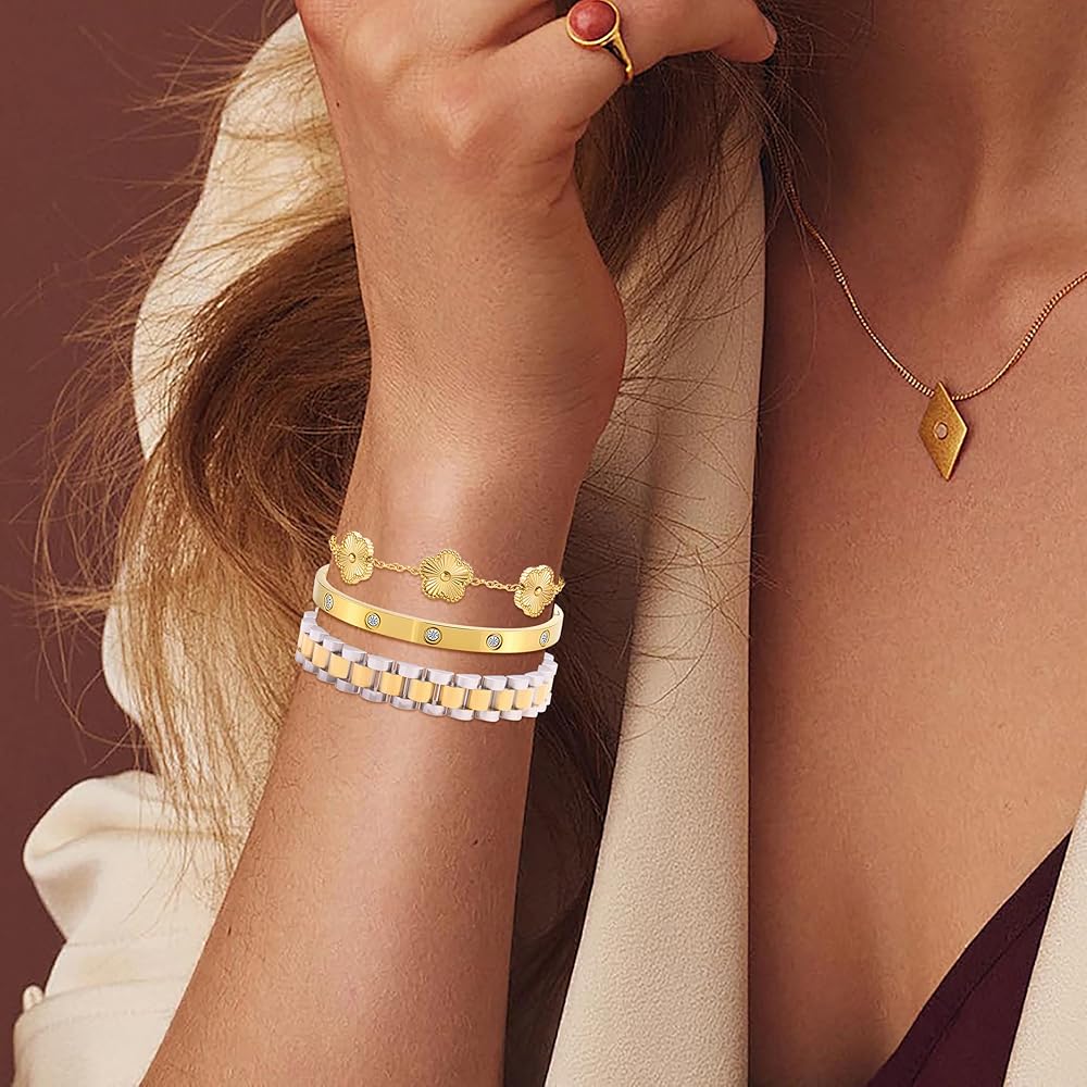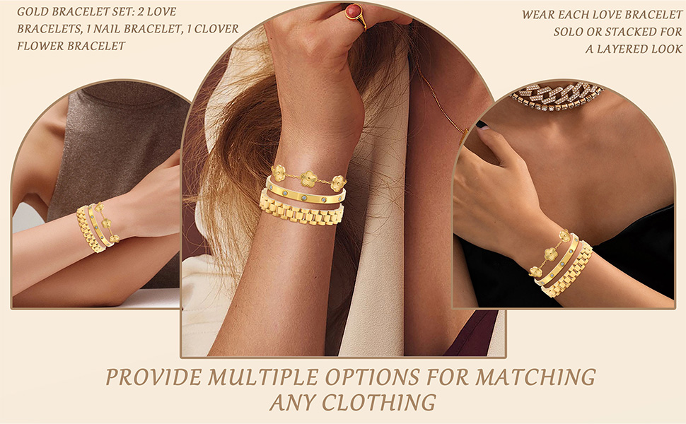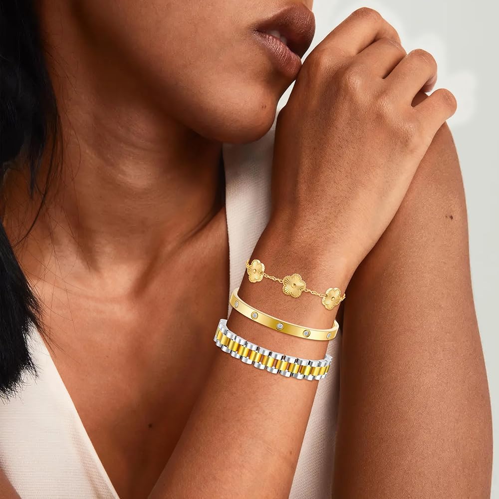 🍀تصميم بسيط: يمكن ارتداء كل سوار ذهبي للنساء بشكل منفصل أو معًا للحصول على مظهر متعدد الطبقات مع سلاسل أخرى. تحتوي على ثلاثة أنماط: سلسلة يد البرسيم، وسوار الحب، وسلاسل حزام الساعة، مما يوفر المزيد من الخيارات لمطابقة ملابسك المتنوعة. تعتبر مجموعة الأساور الذهبية هذه مثالية لمحبي أساور البرسيم الذين يفضلون المجوهرات المستوحاة من المصممين.