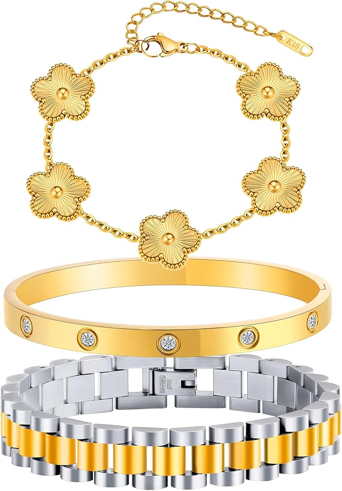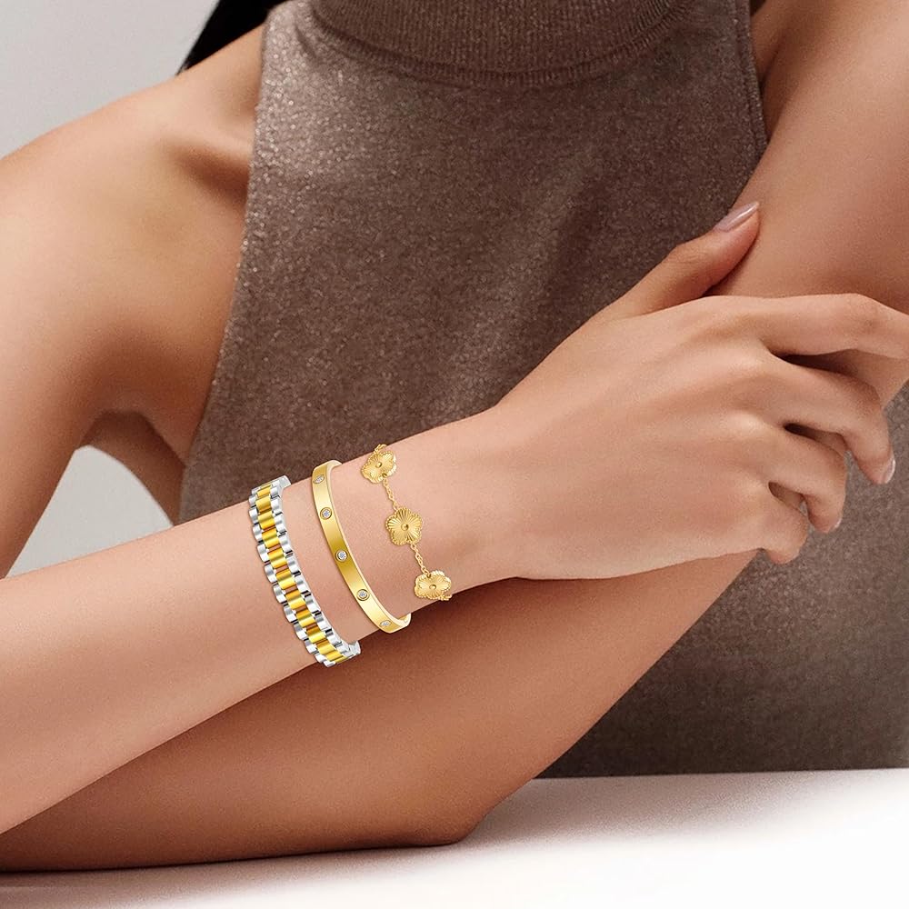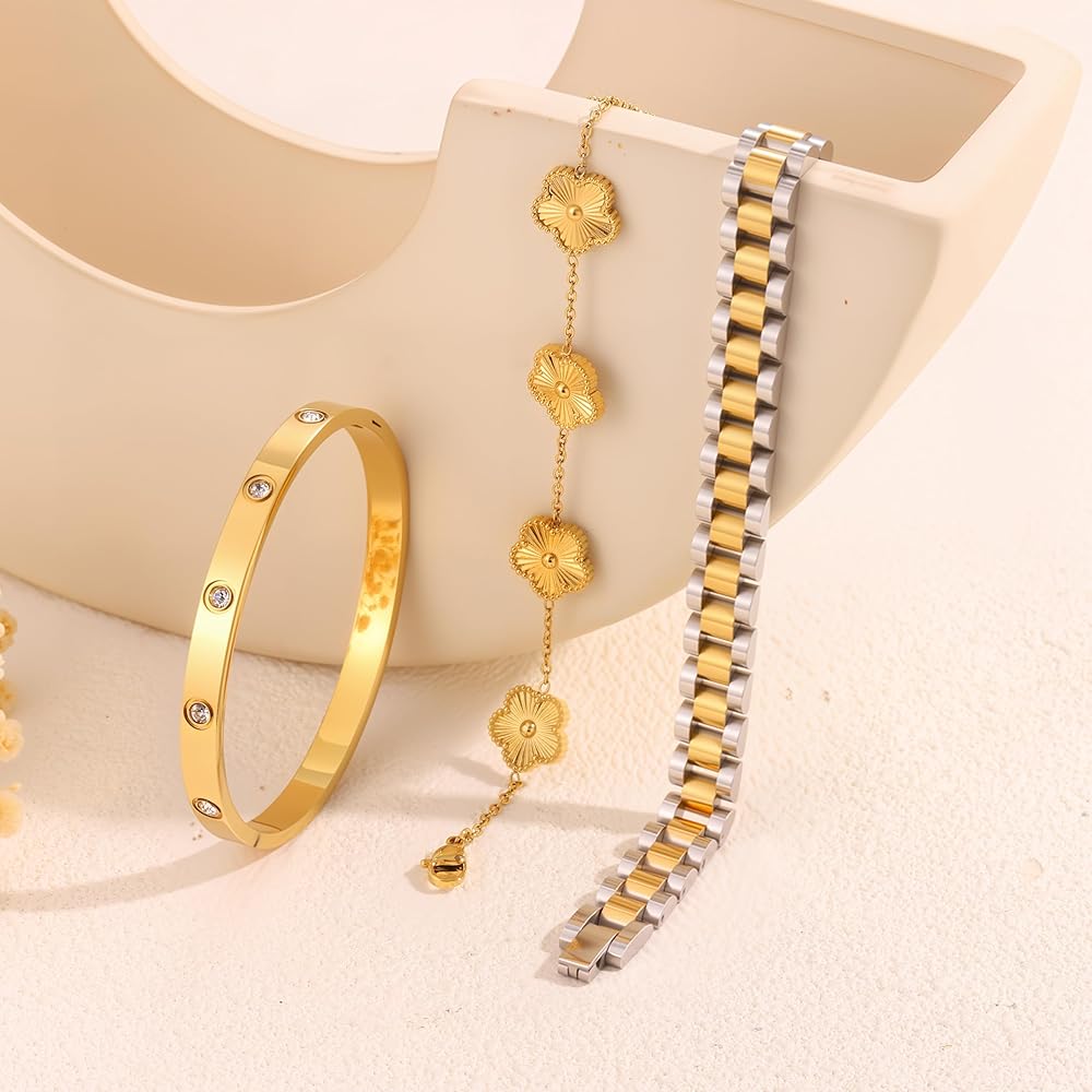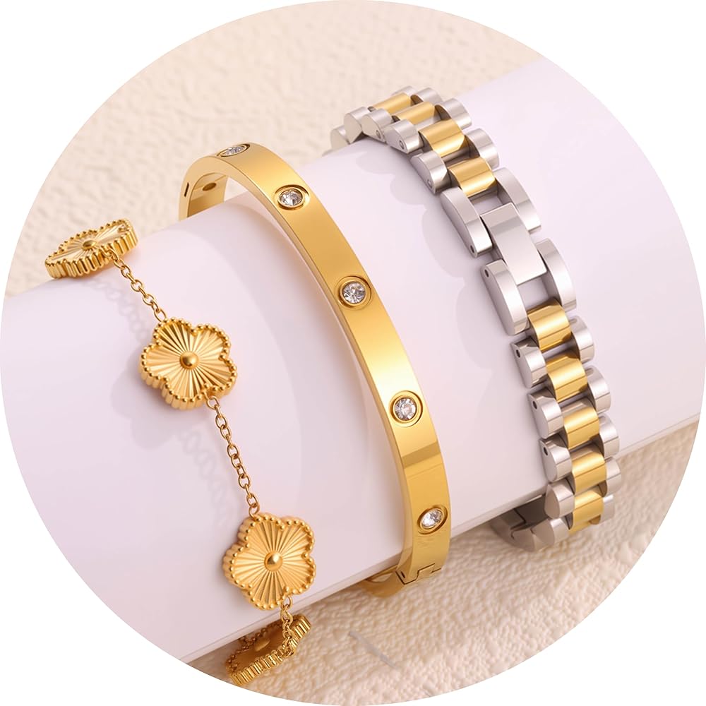 🍀تصميم بسيط: يمكن ارتداء كل سوار ذهبي للنساء بشكل منفصل أو معًا للحصول على مظهر متعدد الطبقات مع سلاسل أخرى. تحتوي على ثلاثة أنماط: سلسلة يد البرسيم، وسوار الحب، وسلاسل حزام الساعة، مما يوفر المزيد من الخيارات لمطابقة ملابسك المتنوعة. تعتبر مجموعة الأساور الذهبية هذه مثالية لمحبي أساور البرسيم الذين يفضلون المجوهرات المستوحاة من المصممين.