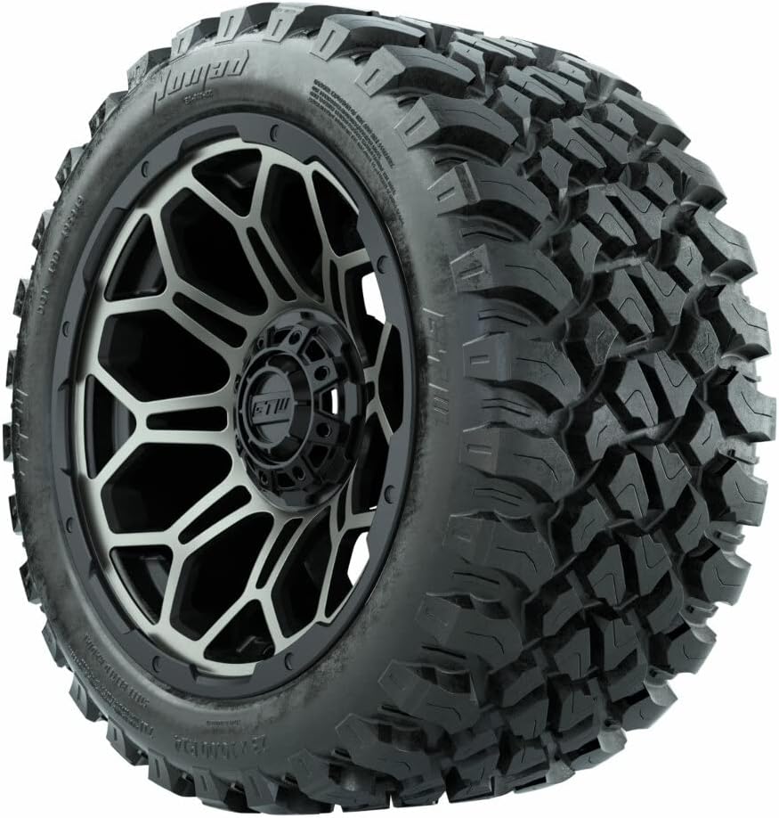 ملاءمة عالمية: تعمل مع معظم موديلات عربات الجولف المرتفعة، الغاز أو الكهرباء، على العشب أو الرصيف؛ 4-4 (4 × 101.6 ملم) نمط الترباس؛ سوف تتطلب موديلات Club Car السابقة وجود فاصل/رفع منخفض المستوى لملاءمة مجموعة العجلات والإطارات هذه