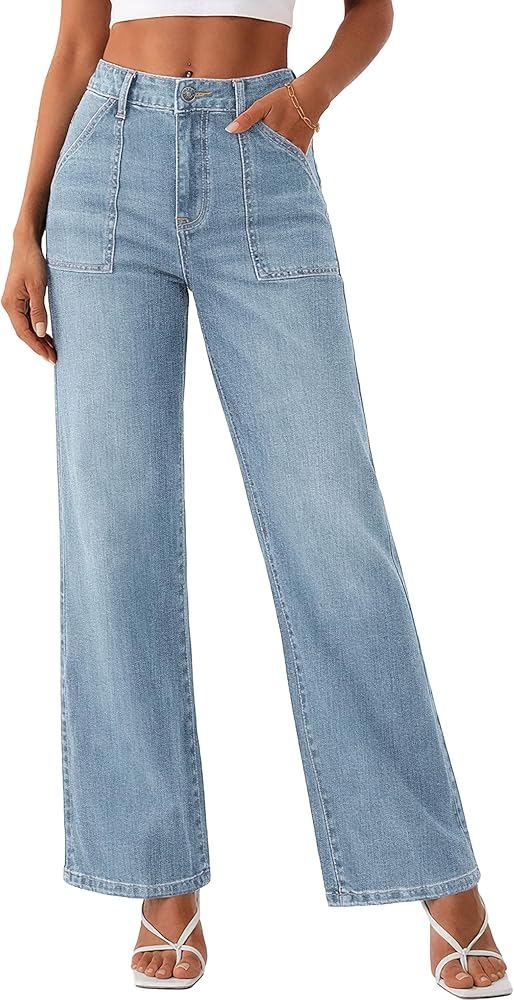 جينز نسائي واسع الساق قابل للتمدد مناسب لجميع أنواع الجسم، ويظهر صورتك الظلية بسهولة بمقاس جذاب
