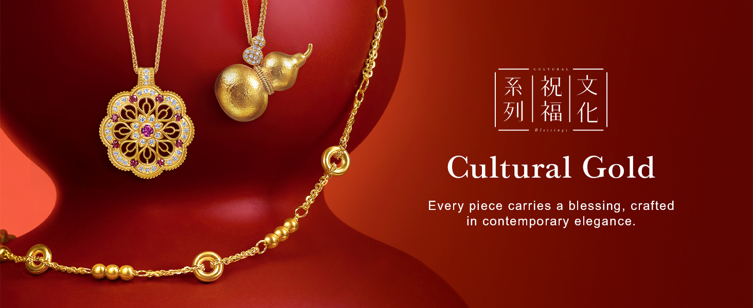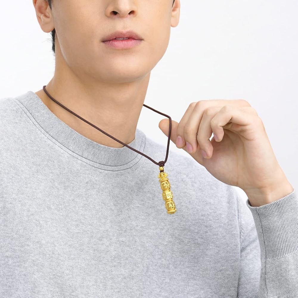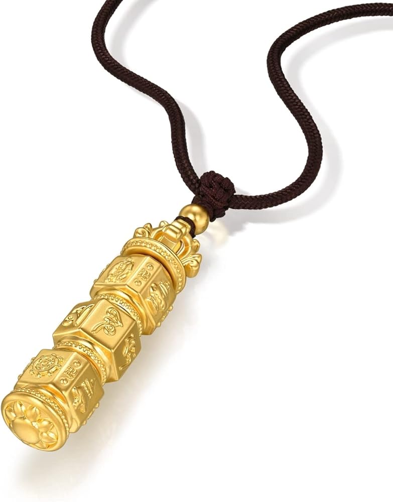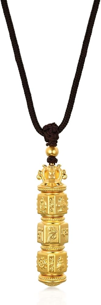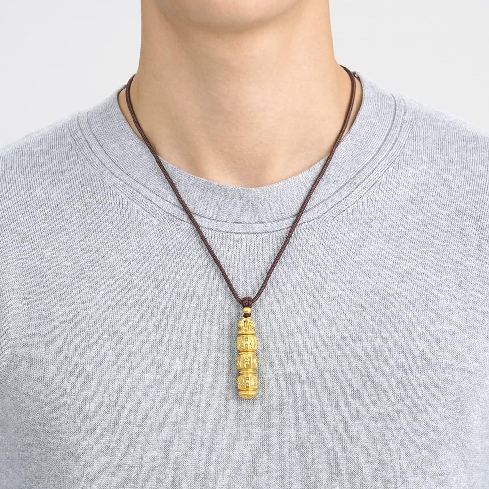 مستوحاة من عجلة الصلاة في البوذية التبتية، تتميز هذه القلادة الذهبية ثلاثية الأبعاد بتقنية التشكيل الكهربائي لتحسين الطبقات. إن تدوير العجلات الثلاث القابلة للدوران المنقوش عليها عبارة "Om Mani Padme Hum" و"التمائم الثمانية" يمثل تلاوة الشعار المكون من ستة أحرف للتمني بالسلام والحظ.