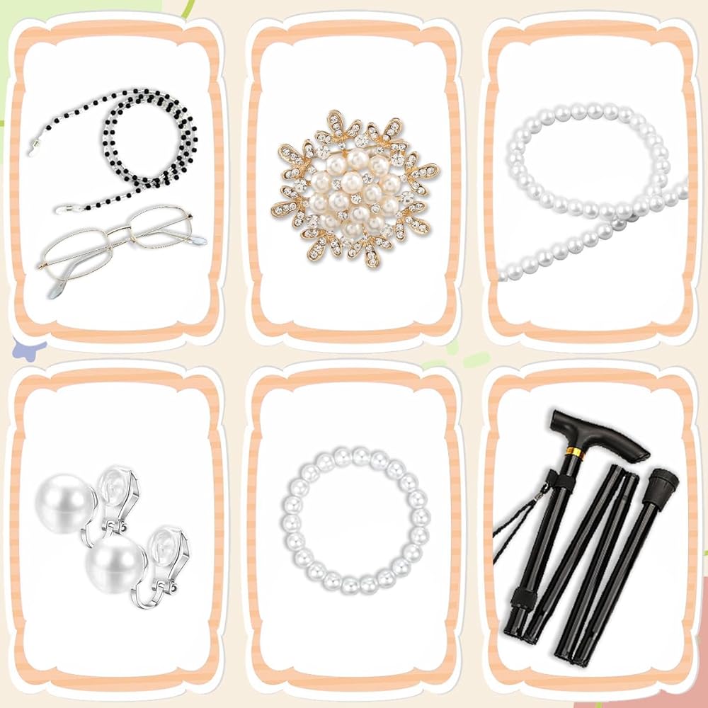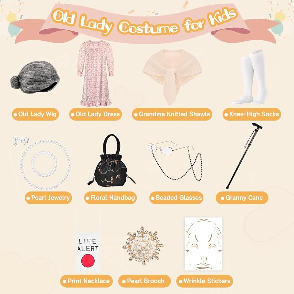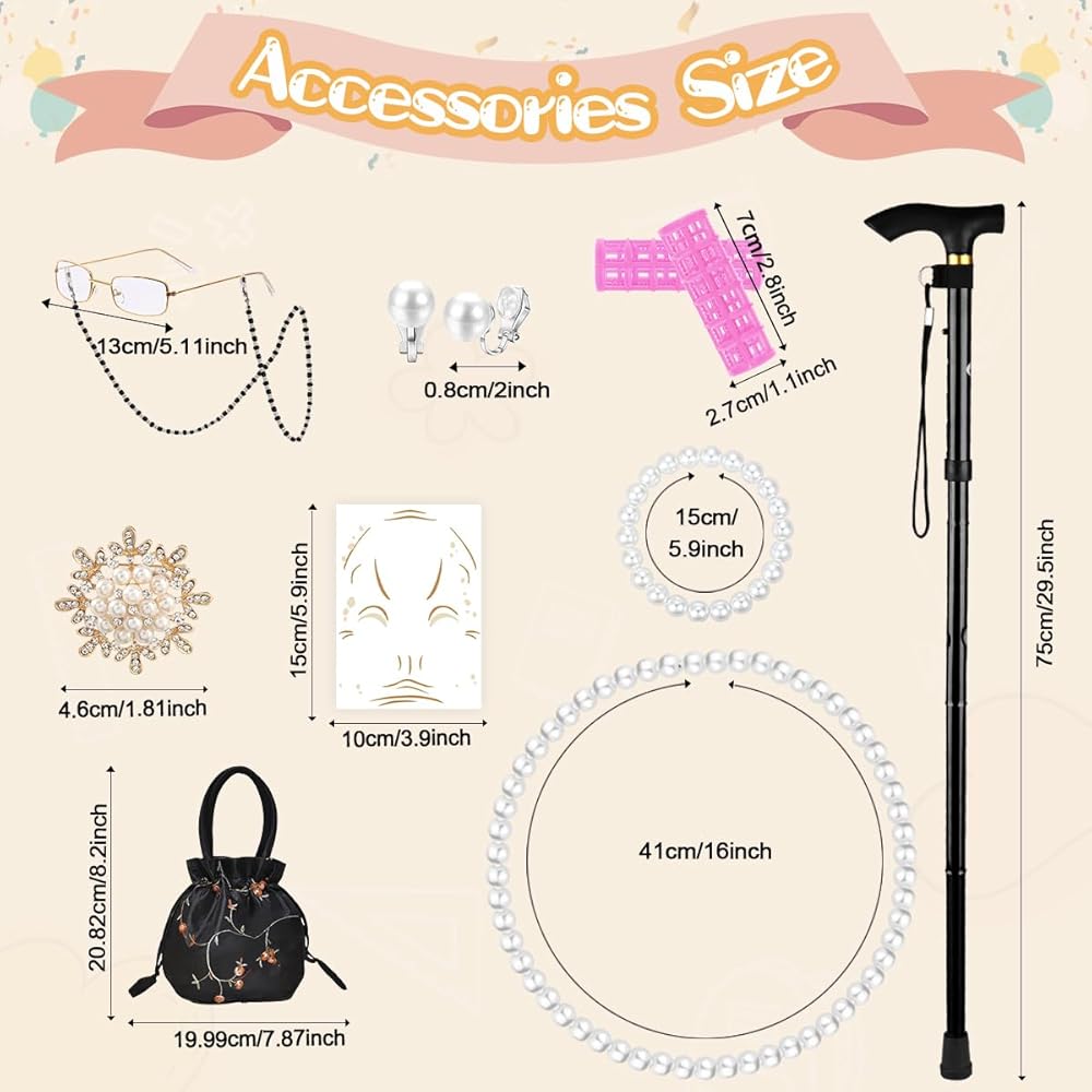 13PCS Old Lady Outfits Accessories Set Includes : Old lady wig, old lady dress, knitted shawls, granny cane, pearl necklace, pearl bracelet, pearl brooch, pearl ear clips, knee-high socks, handbag, beaded glasses, print necklace, and wrinkle stickers. Everything you need is really fascinating.