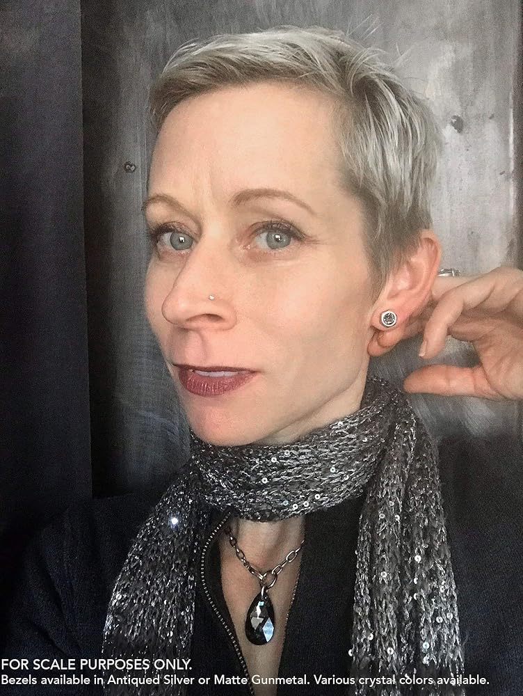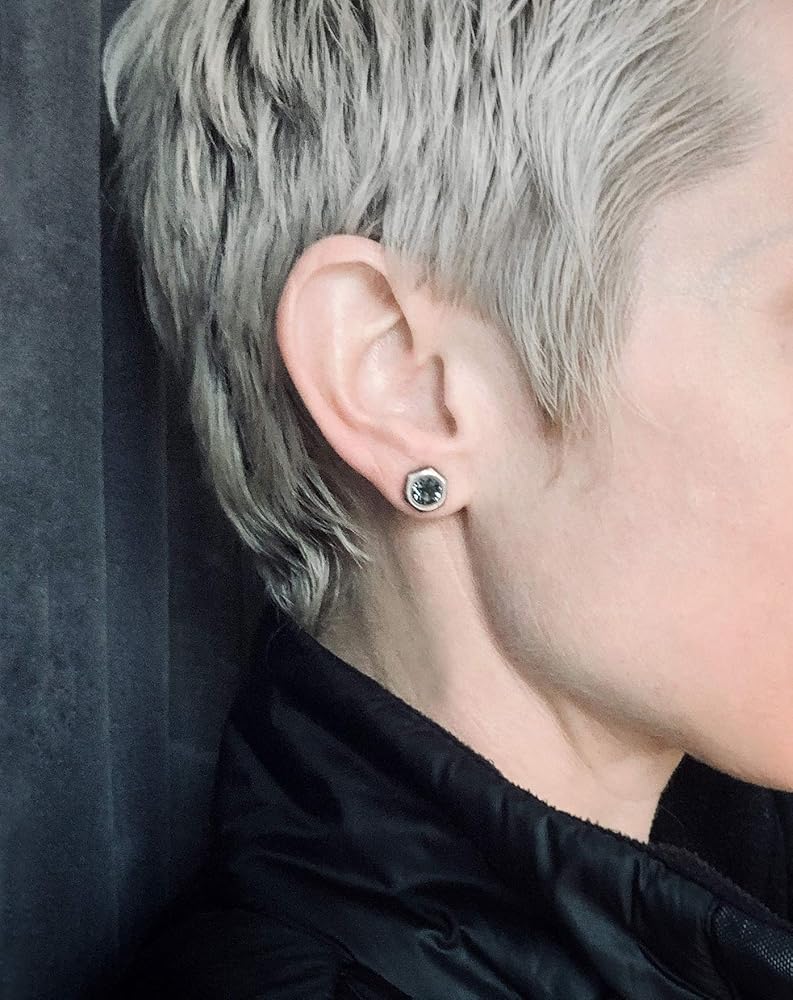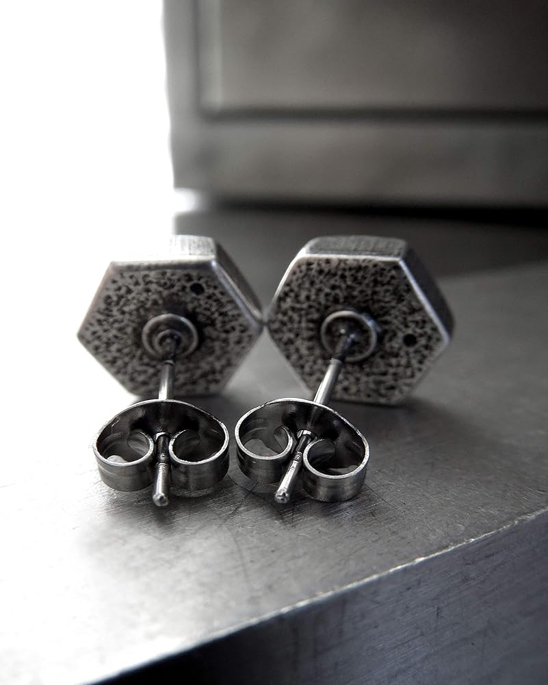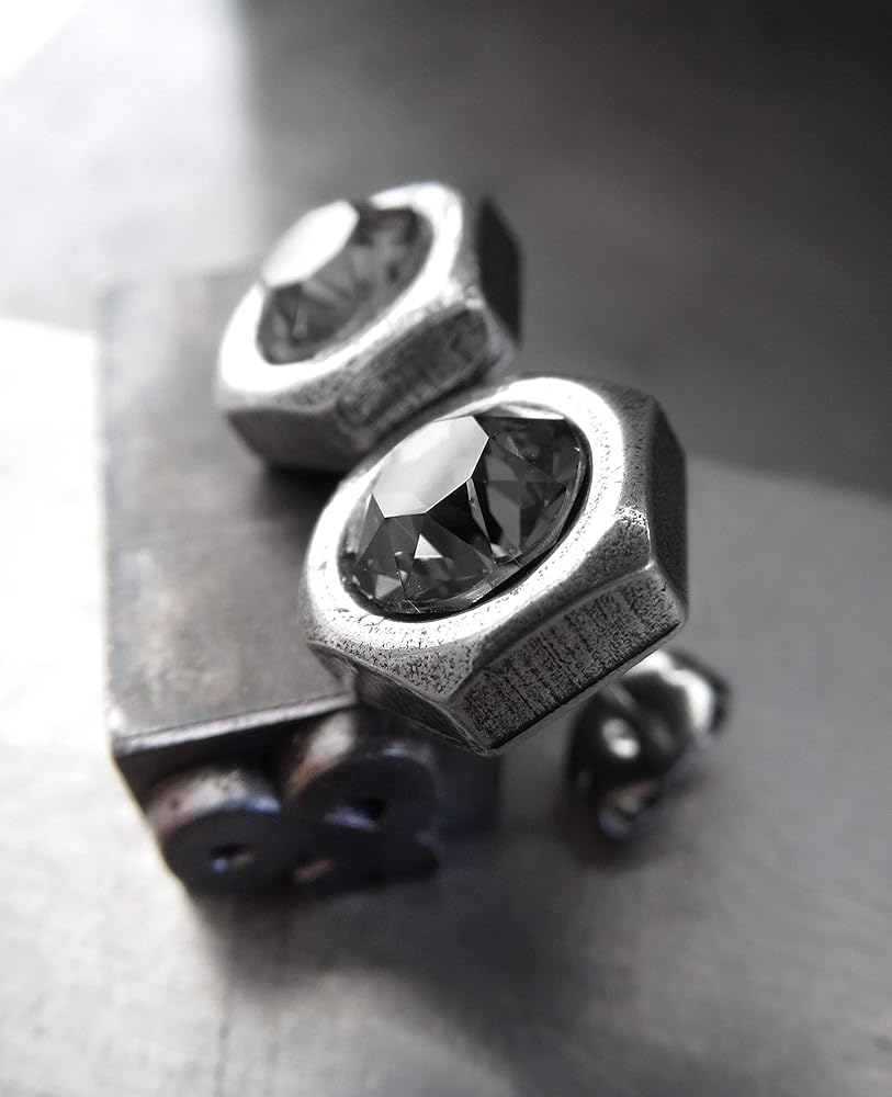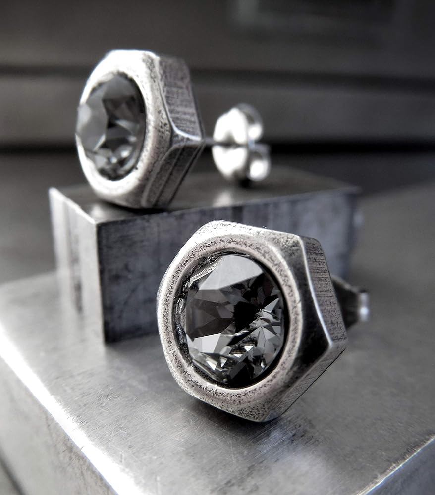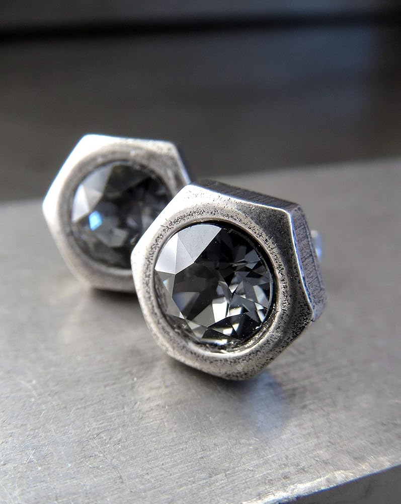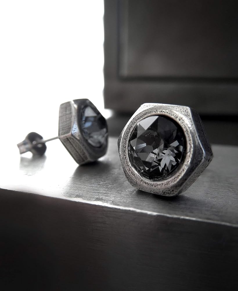 أقراط بسيطة على الطراز الصناعي على شكل صامولة سداسية - مثالية للرجال والنساء! تتميز بلورات أحجار الراين الفاخرة ذات الأوجه المثالية والمتلألئة بعمق بلون رمادي فحمي داكن.