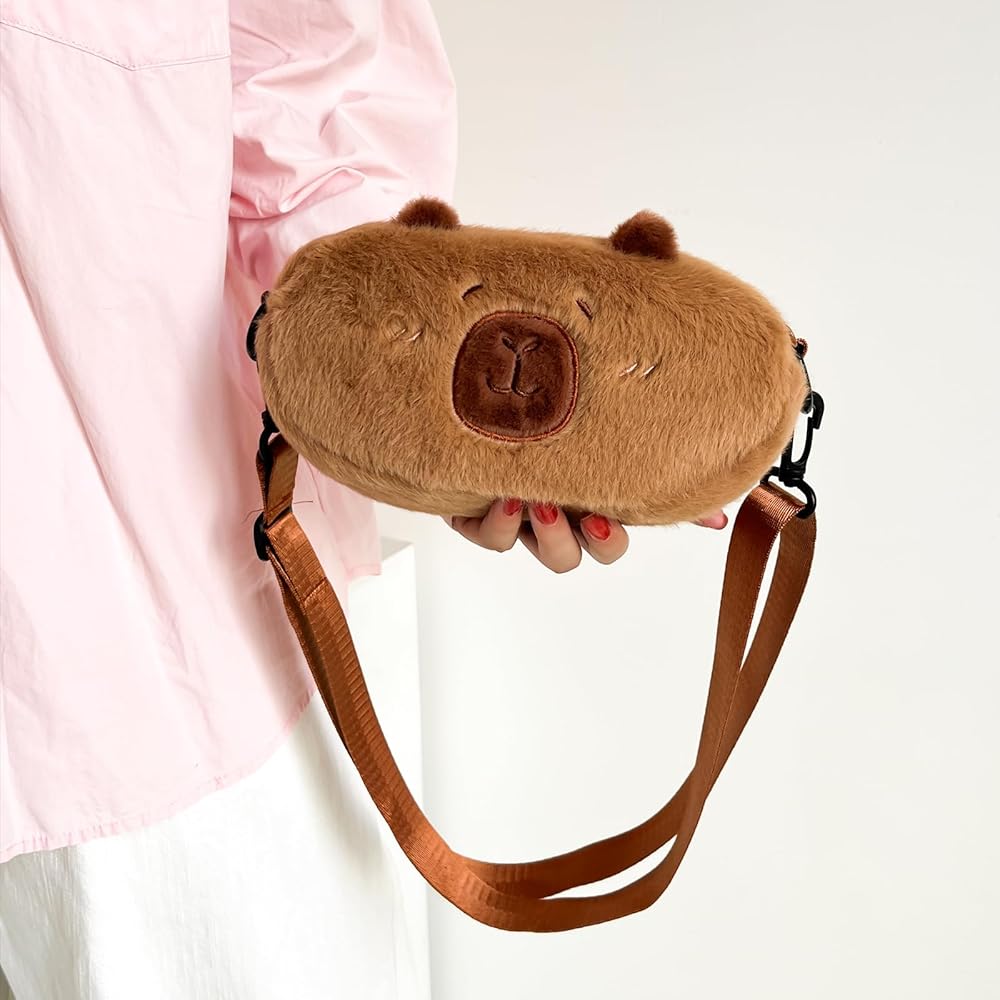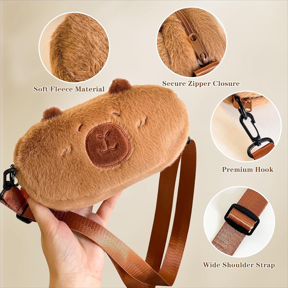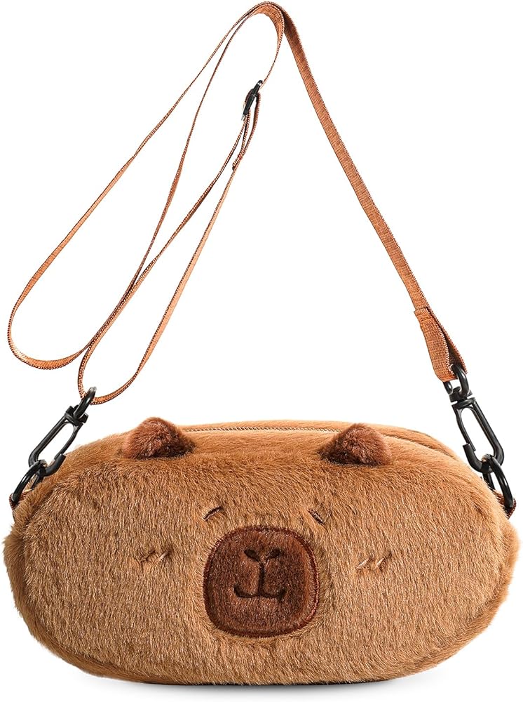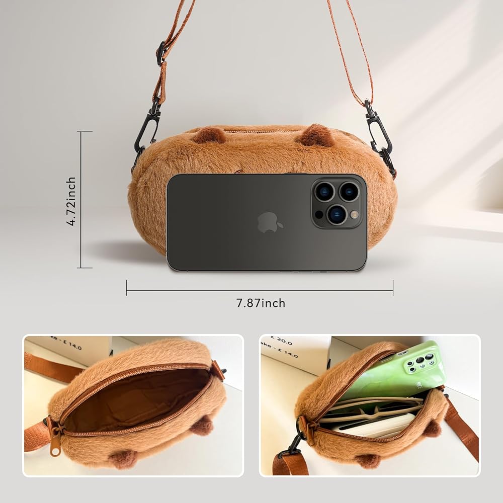 Meet Your Cuddly Companion!This adorable Capybara Crossbody Bag combines irresistible charm with everyday practicality. Crafted from cloud-soft hypoallergenic plush, its 3D embroidered capybara face sparks smiles wherever you go. Perfectly sized for phones up to 6.8" + daily essentials. The adjustable strap (28"-42") ensures all-day comfort.【Product Specifications】Material: Faux Fur PlushWeight: 0.18 lbDimensions: 7.87 × 4.72 × 3.15 inStrap Length: Adjustable (28"-42")