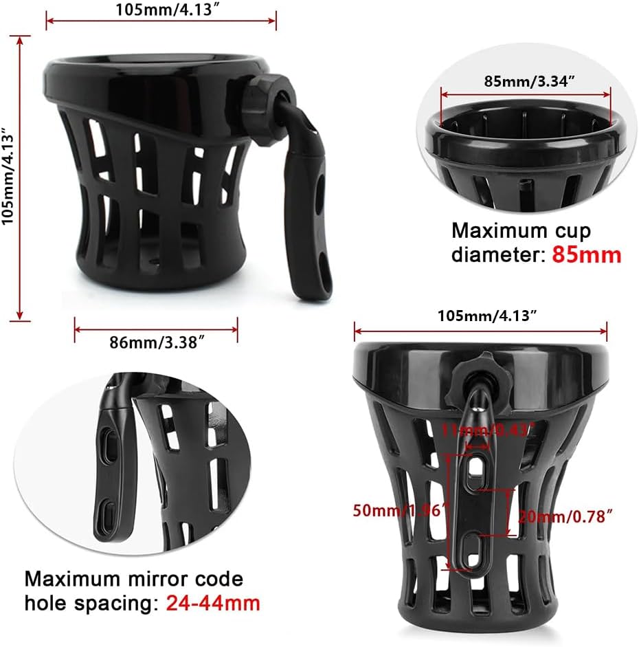 أبعاد التثبيت: يتم تثبيت حامل المشروبات على التحكم الأيسر أو الأيمن. يتم توفير مقاسين من البراغي لاستيعاب المزيد من الموديلات: خيوط قياسية بريطانية 6 مم 1/4 وخيوط قياسية دولية 6 مم. يتم استخدام برغي واحد للتثبيت على h-arley، لجميع موديلات h-arley 1996-up مع حوامل القابض أو مجثم الفرامل (2014-up Street 500 وStreet 750 غير متضمنة). يُستخدم الآخر للتركيب على ح-أوندا، ل Goldwing GL1800 2018-up (ONTY لمفتاح DCT أو CB المثبت على جانب الفرامل للدراجات).