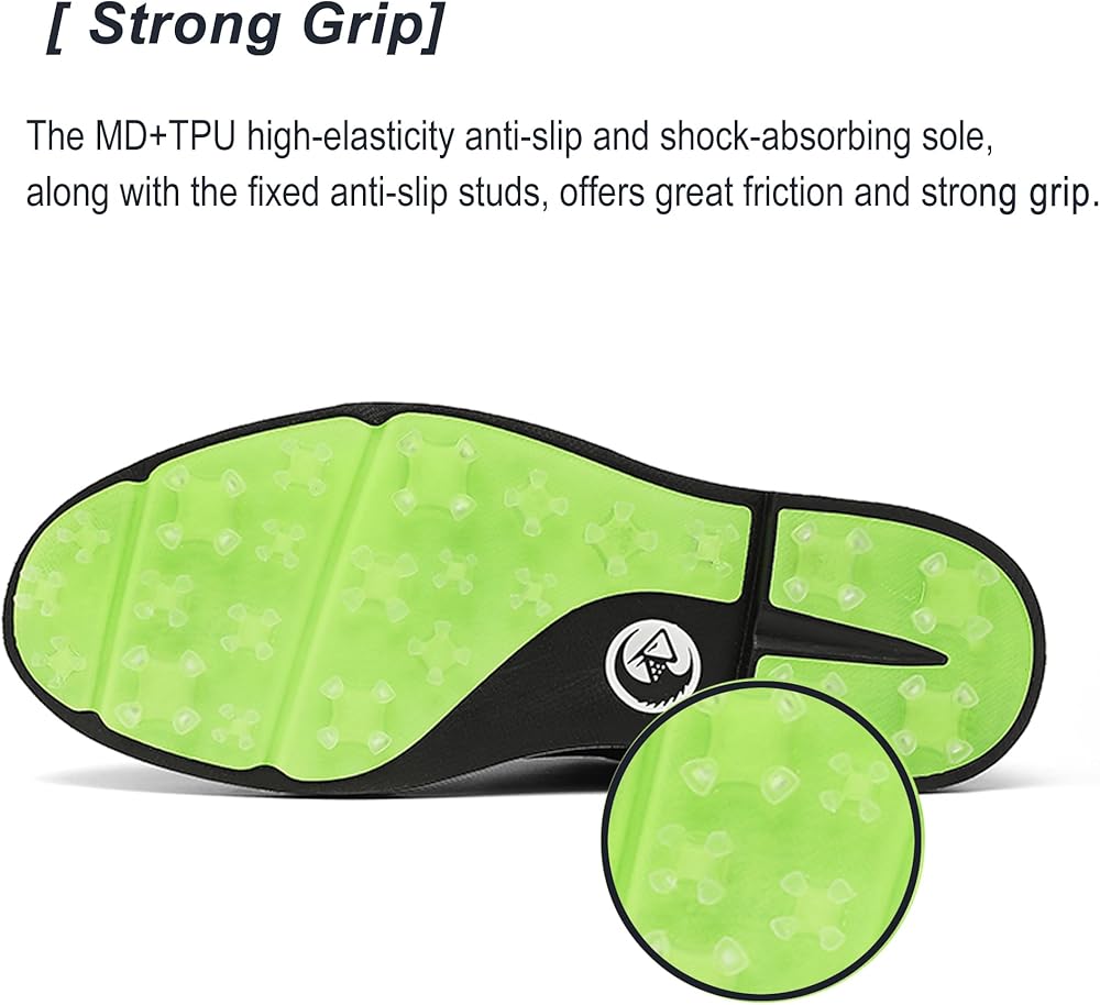 • 【 نظام قبضة لجميع التضاريس | جر لا يتزعزع على المنحدرات 】 نعل أوسط من الفيلون (إسفنج خفيف للغاية) + طبقة الالتواء من مادة TPU + مرابط موضوعة بشكل استراتيجي. قبضة عشبية رطبة أقوى من أجل قدم آمن.