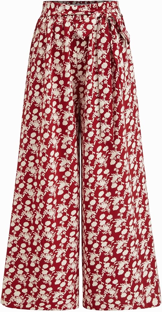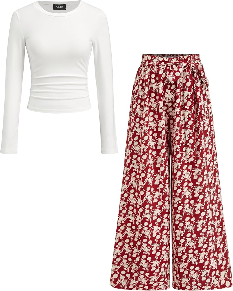 سروال Palazzo نسائي واسع الساق بطبعة زهور من CIDER، بنطال مرن عالي الخصر مع بلوزة بأكمام طويلة