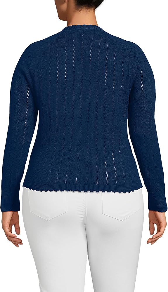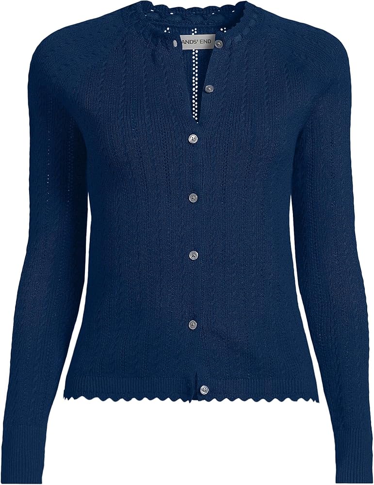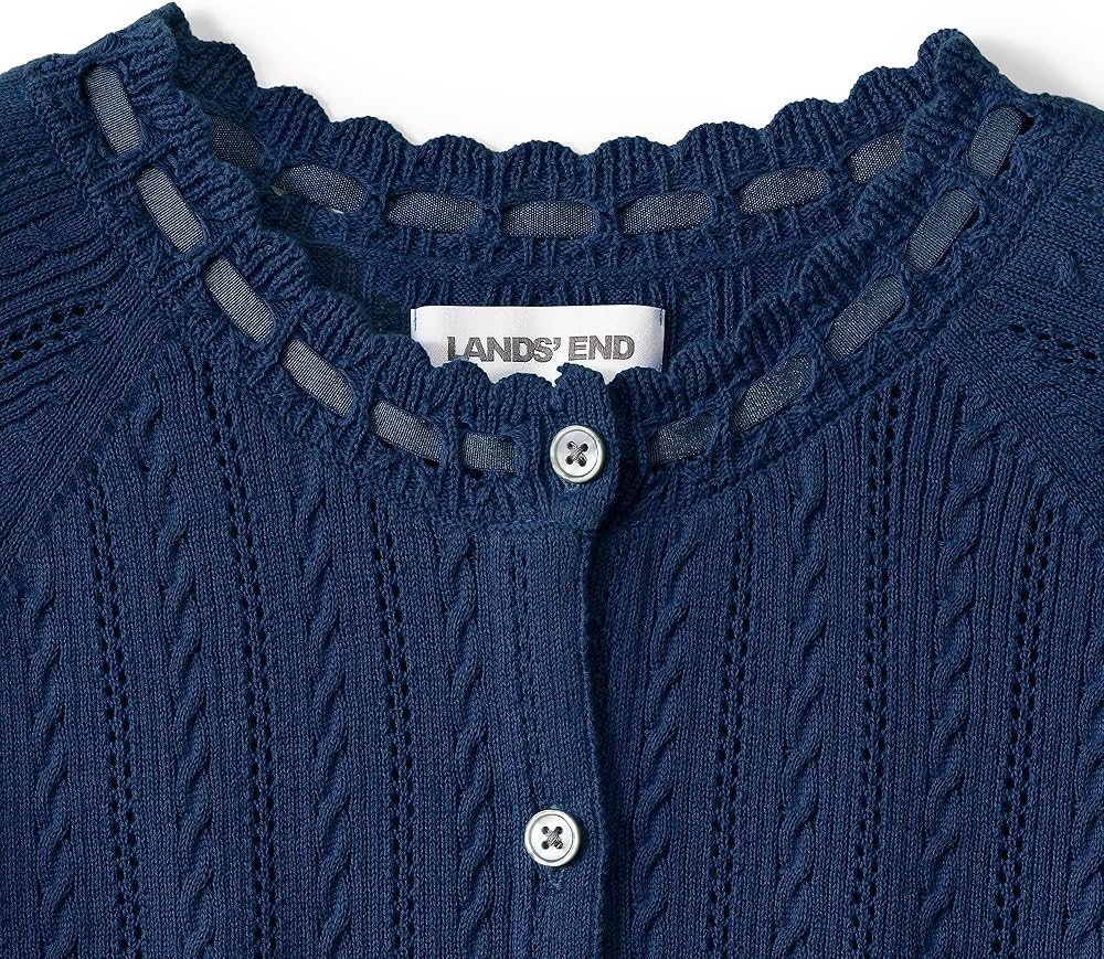 Delicate knit meets refined charm with this lightweight pointelle cardigan, perfect to wear any time of the year. With pretty details like the satin neck ribbon and fine scallop hemline, it adds a touch of femininity to your look. Wear it on its own over a pair of jeans for a more laid back look or dress it up over a dress for a fancier occasion.