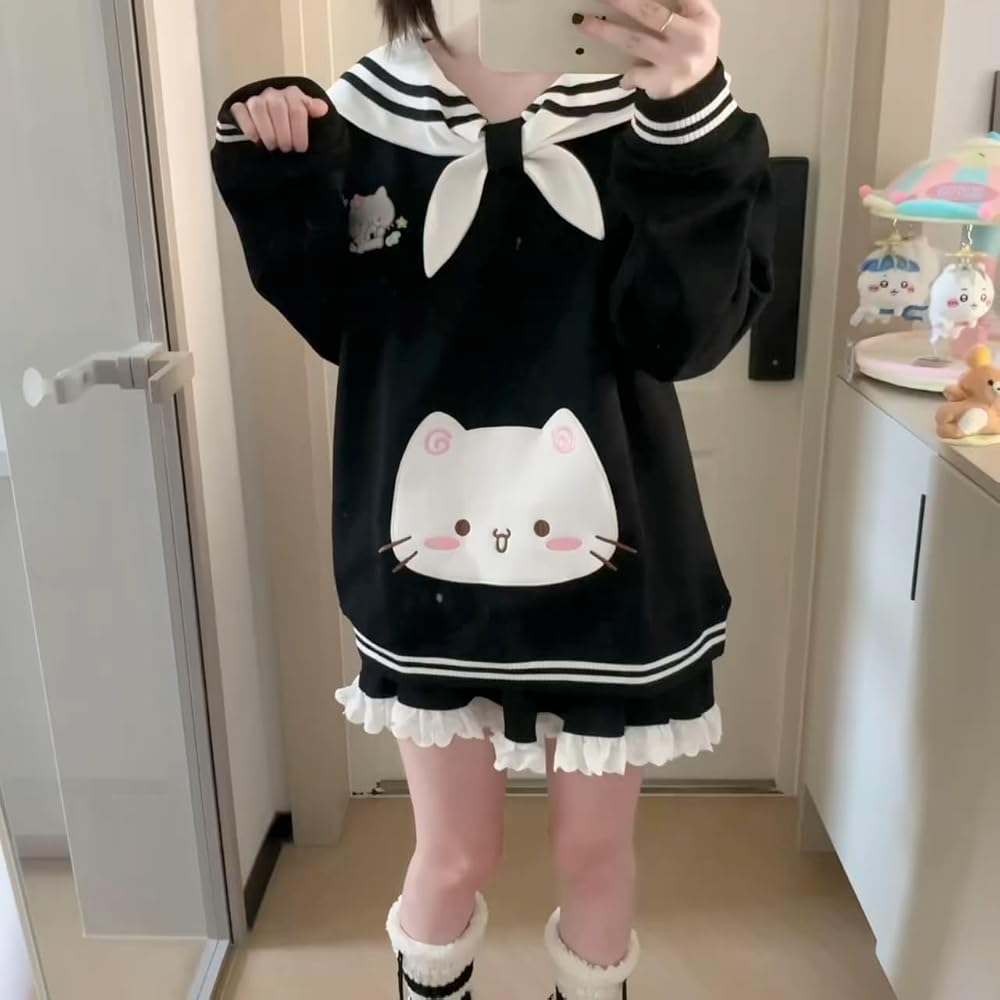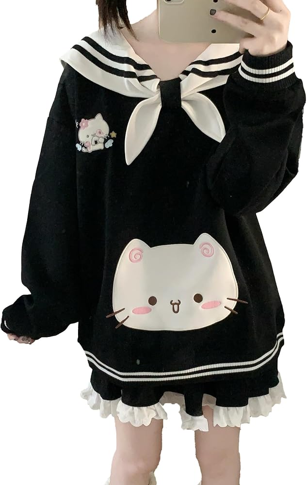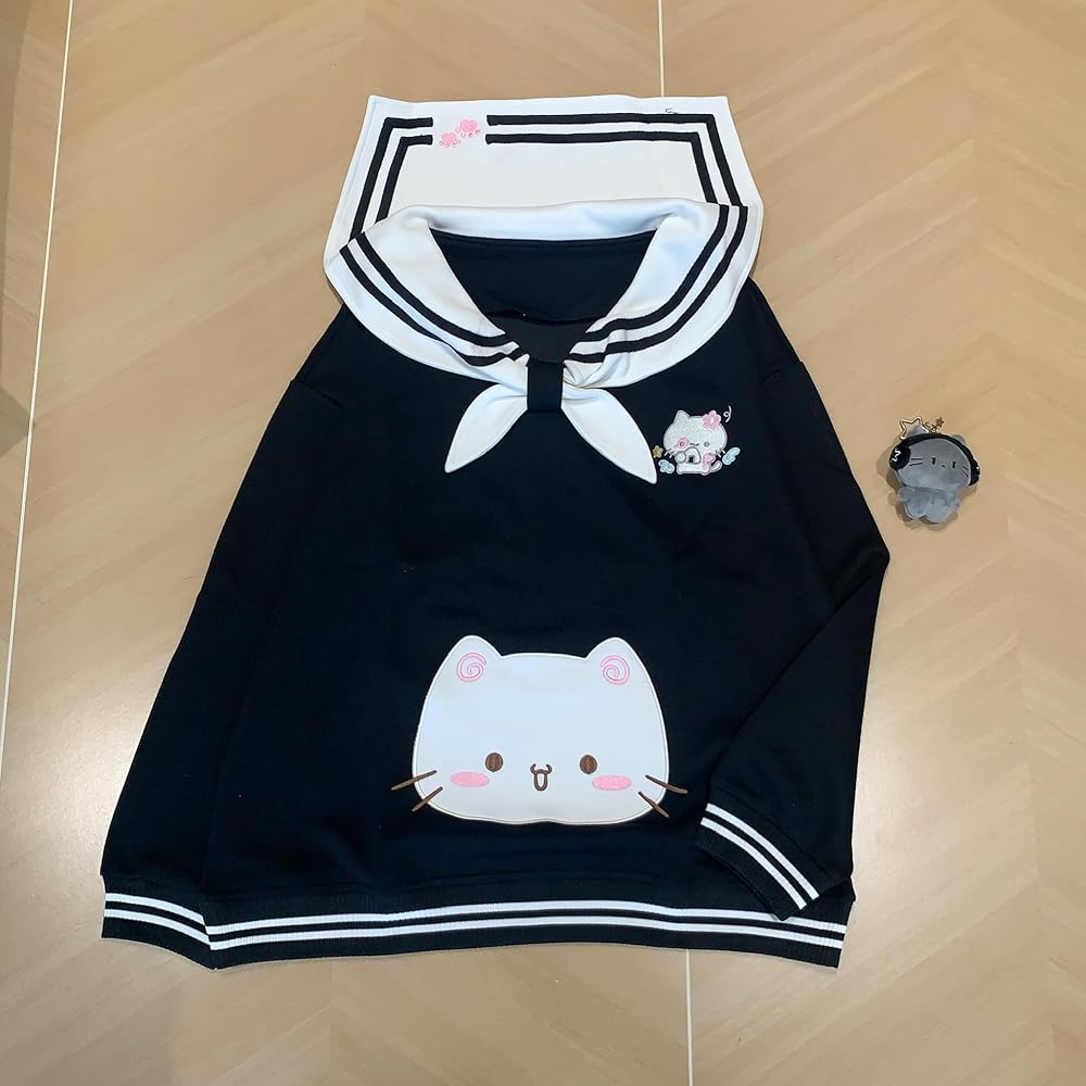 Elevate your wardrobe with this Kawaii Y2K-inspired Doll Collar Cat Graphic Sweatshirt – the ultimate fusion of playful charm and streetwear comfort! Designed for fashion-forward individuals who adore Harajuku-style aesthetics, this ribbed stripe sweatshirt combines nostalgic early-2000s vibes with modern coziness. The oversized doll collar framed with delicate embroidery creates an irresistibly cute silhouette, while the bold cat face graphic adds a touch of whimsical personality to your casual outfits.