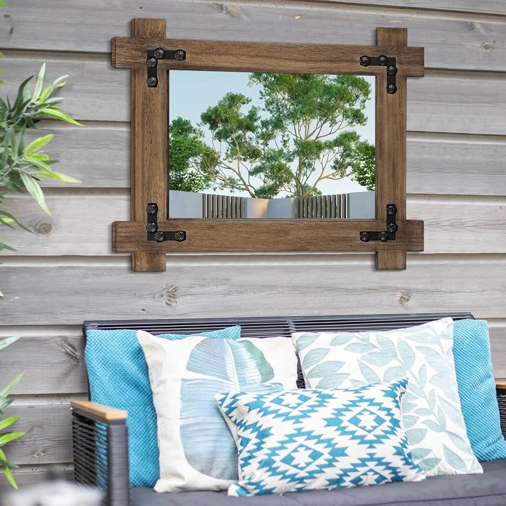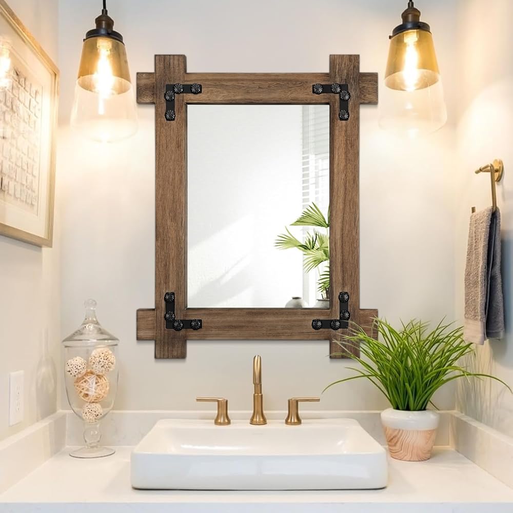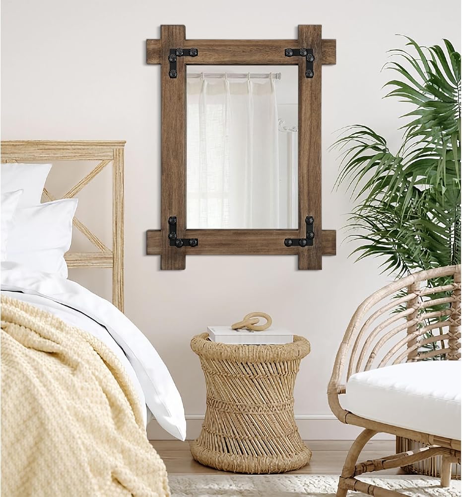 The rustic wood-framed wall mirror is the perfect addition to any farmhouse style.