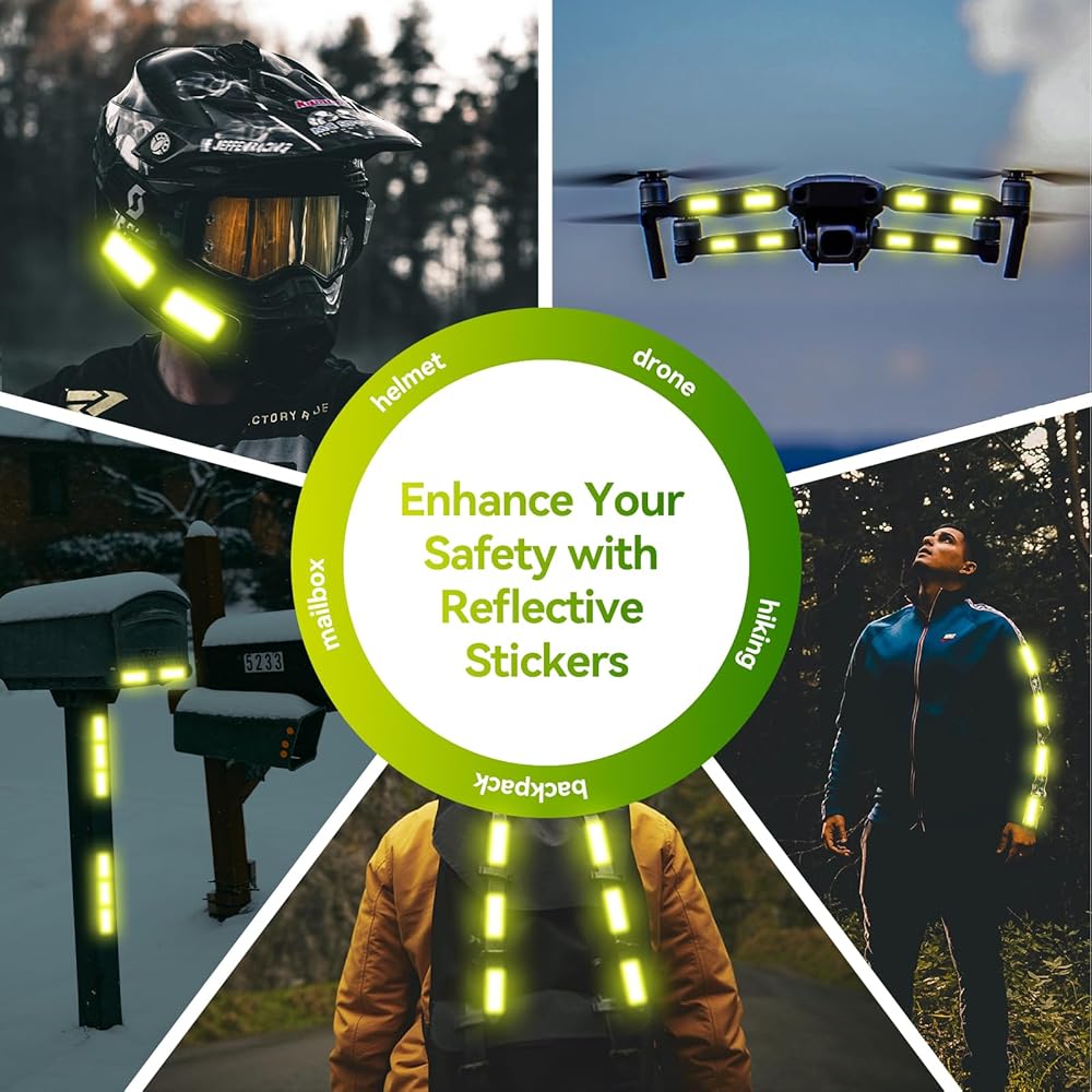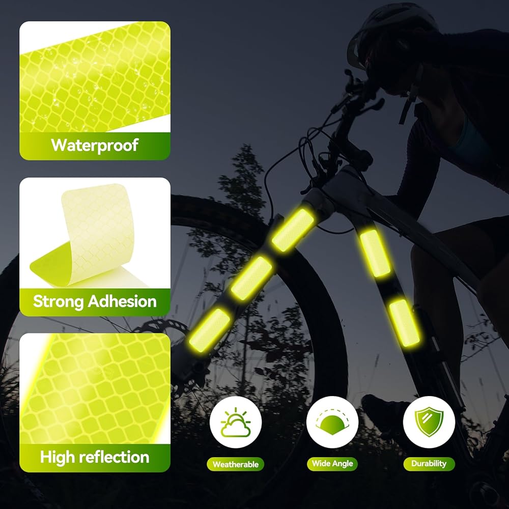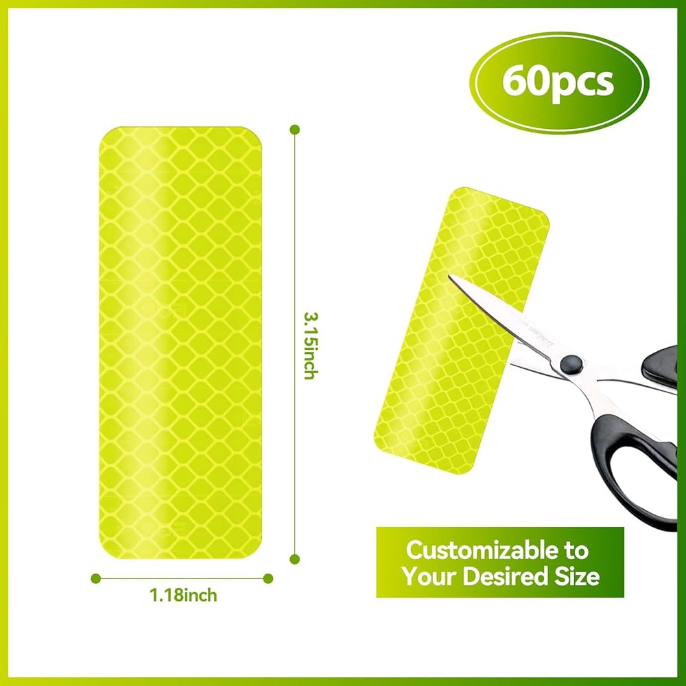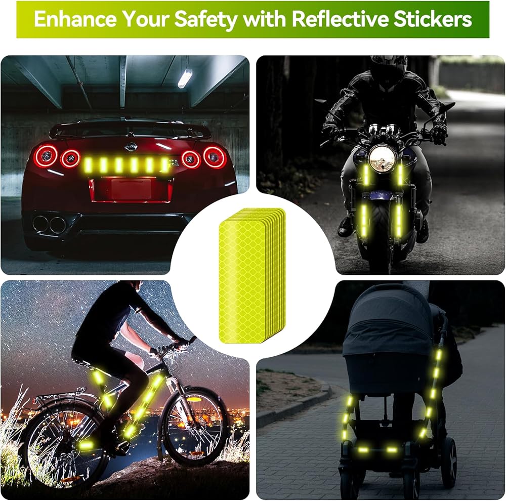 سلامة ليلية معززة: تعمل ملصقاتنا العاكسة على تحسين الرؤية بشكل كبير في ظروف الإضاءة المنخفضة، مما يضمن لك البقاء آمنًا أثناء الأنشطة الليلية مثل الركض أو ركوب الدراجات أو المشي.